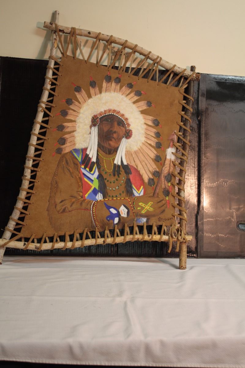 A native American rawhide picture of a chief with wood branch framing - Signed MB Peterson