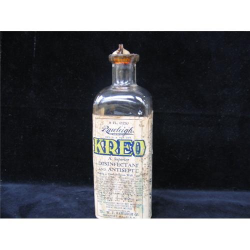 This is a wonderful old advertising free sample of Rawleigh's Kreo Disinfectant & Antiseptic, 8 oz., with the original wrap-around label intact. The label gives directions for how to use the contants for Baby's Birth, Disinfecting the Sick Room, For Minor Wounds, Cuts, and Bruises, and for Personal Hygeine. It has the original cork, which has a metal loop for removing it easily. On the loop is printed "Compliments The Rawleigh Man." The contents are now a solid and, additionally, secure within the cork, such that nothing will spill or seep out. The label has one small tear at the top on one side. If you are interested in old advertising items, please see the other pieces I have for sale (fixed price) on my GoAntiques site!