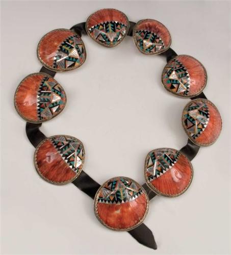 Ray Adaki (Navajo) Inlaid and Silver Decorated Shell Concho Belt. 38" long. Each concho is 3 1/4" x 3". Finely decorated. (est $1,500-2,500)