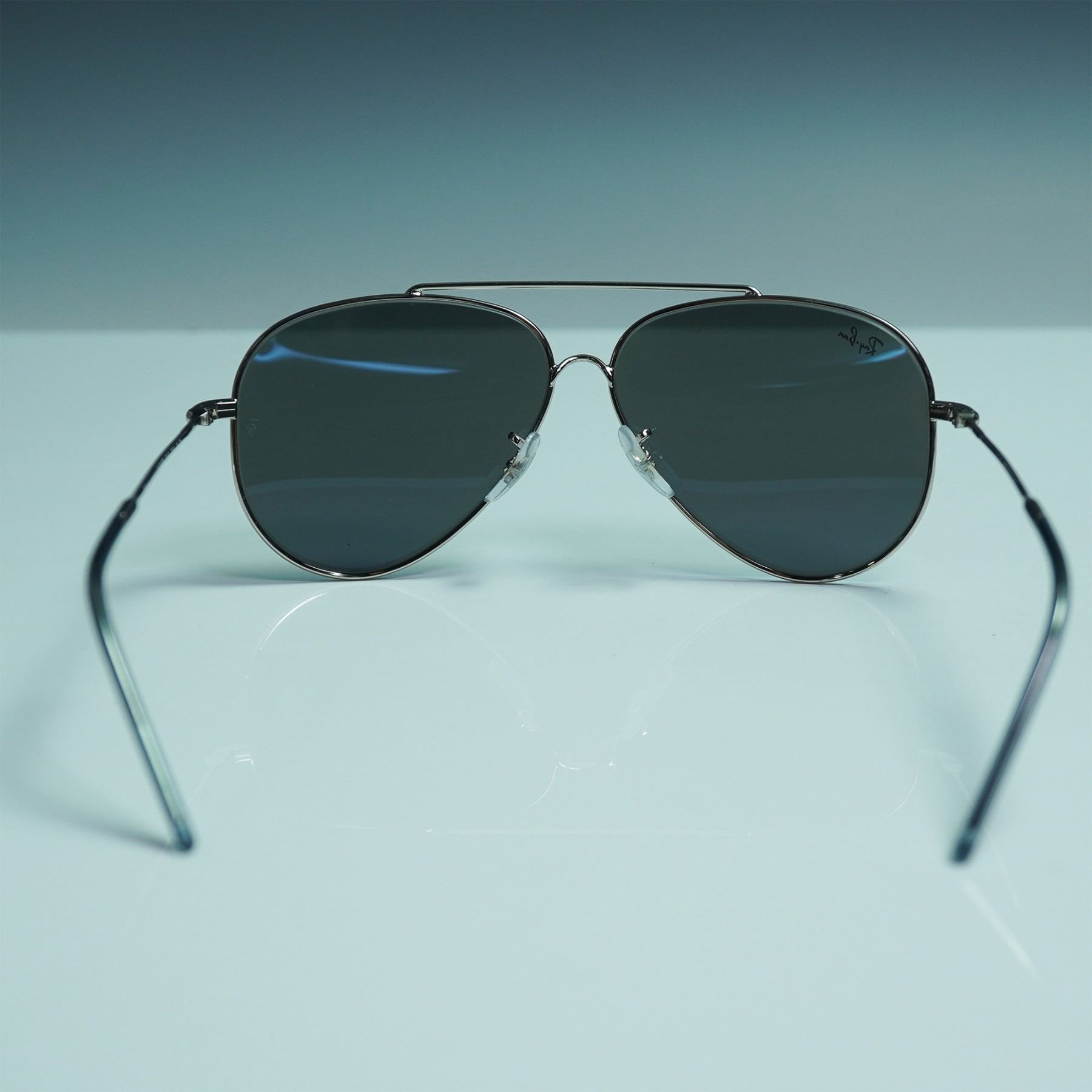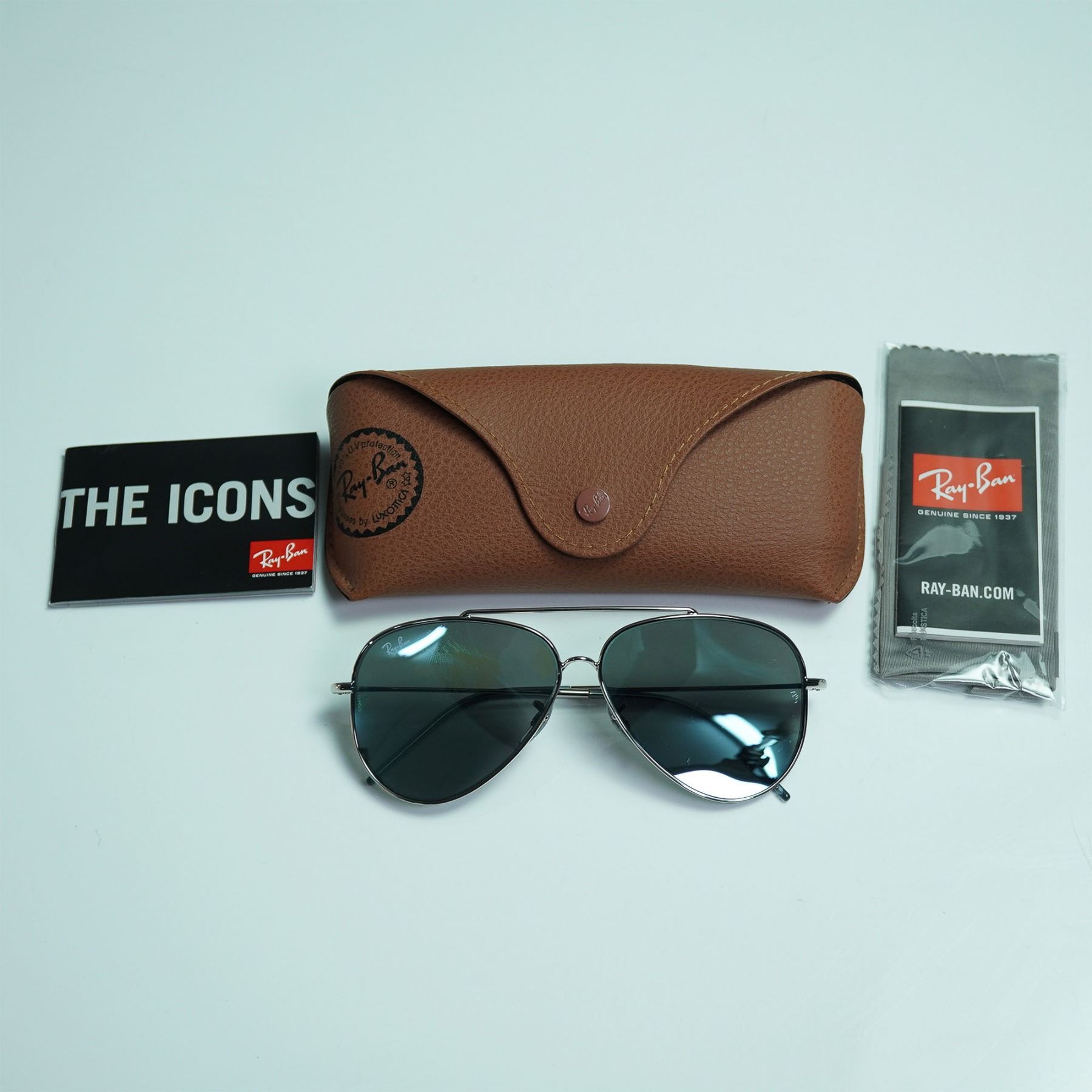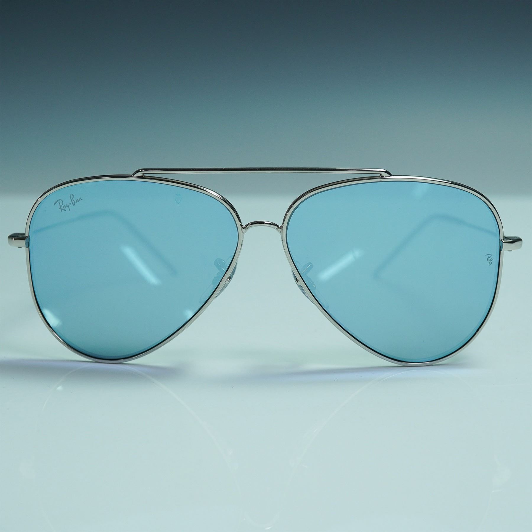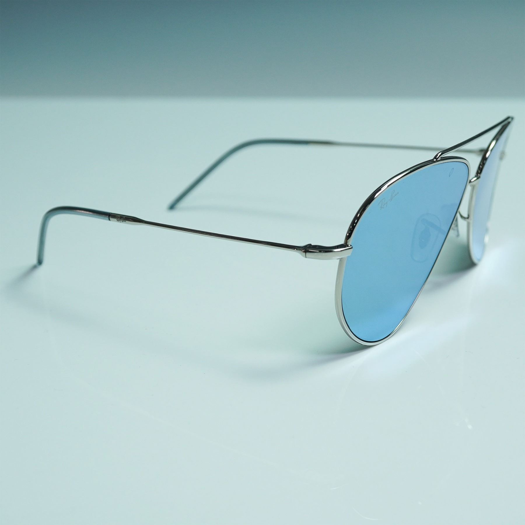 A pair of Ray-Ban Aviator Reverse 008/GA sunglasses featuring a contemporary twist on the classic aviator design. These sunglasses incorporate Ray-Ban's innovative reverse lens technology, crafted with biobased material for sustainability. The silver-tone metal frame is lightweight and durable, complementing the striking blue-tinted lenses that provide 100% UV protection. Made in Italy, this premium pair comes with the original Ray-Ban leather case, cleaning cloth, and informational booklet.