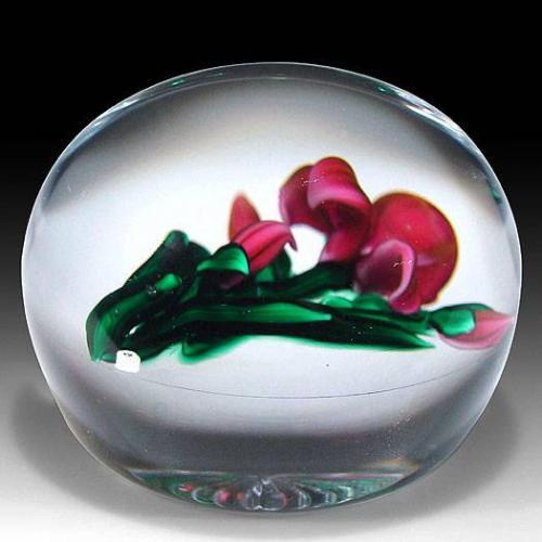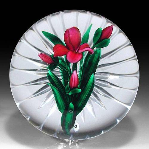 Ray Banford dark pink iris paperweight with buds and leaves on clear ground. Star-cut base. Signature cane. Diameter 3 1/4". Donated by: Bob Banford.<p>Proceeds from the auction will go to benefit Santa Cruz, California glass artist Steven Lundberg, who, after 30 years of blowing glass locally, was diagnosed with amyotrophic lateral sclerosis, or ALS (Lou Gehrig's disease). This auction is a fundraising effort to help Steve meet the challenges of this disease.<p>Costs of treating ALS over a period of time can be exorbitant. In the short-term, Steve needs basic equipment such as an electric scooter and pointing devices to help him read and write.<p>Please join us for this auction, and help support a friend. Check out our other auctions to see the 150 paperweights, vessels, and glass sculptures from internationally known glass artists, donated by generous artists, galleries, and glass collectors from all over the country. Please contact us at 1-800-538-0766 or (831) 427-1177 for more information, or see <a href=http://www.selman.com/press target=_blank>www.selman.com/press</a>.