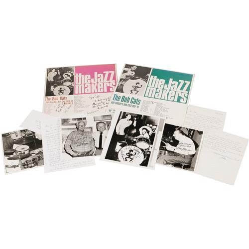 <B>Ray Baudic Signed Record and Photo Group.</B></I> Dynamic drummer Ray Baudic is showcased in this lot. Included are: "Bob Crosby's Bob Cats 1937-42" (Swaggie Records S1245) with its cover signed by Ray Baudic and Yank Lawson (and two signed photos of Baudic, as well as a letter signed by Baudic); and "Bob Crosby's Bob Cats 1938-42 Volume 2" (Swaggie Records S1288) with its cover signed by Baudic, Lawson, and Bob Haggart (and two signed photos of Baudic and Haggart, as well as a letter signed by Haggart).<BR><BR><b>Shipping:</b> Recordings (<a target="_blank" href="http://www.heritageauctions.com/common/shipping.php">view shipping information</a>)