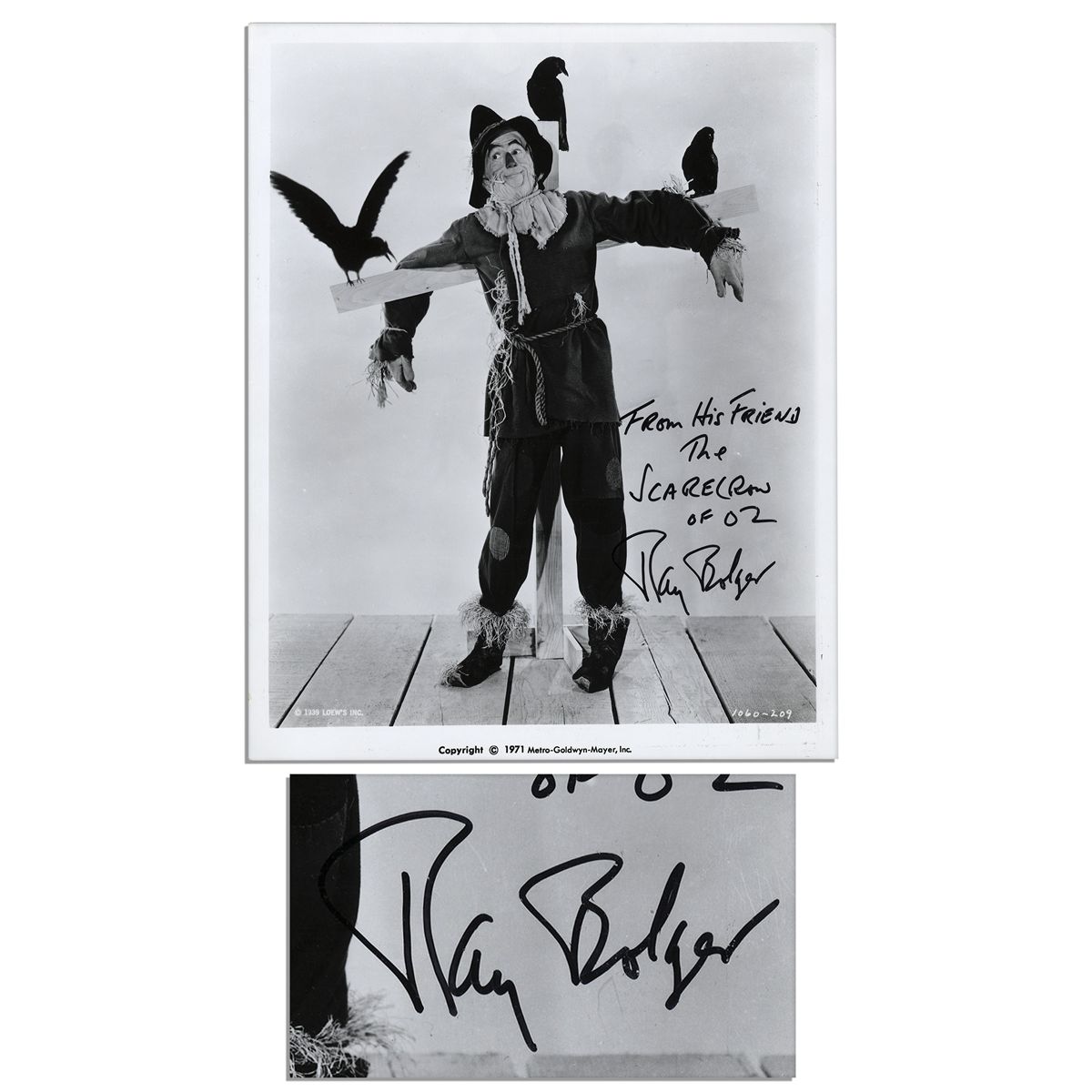 Ray Bolger ''The Wizard of Oz'' photo signed. MGM publicity shot of Bolger in costume as the Scarecrow bears a 1939 Loew's copyright mark on the image and a 1971 reprint copyright on the border. Bolger's autograph inscription reads, ''From His Friend / The / Scarecrow / Of Oz / Ray Bolger'' in black felt tip. Glossy photo measures 8'' x 10''. Near fine.