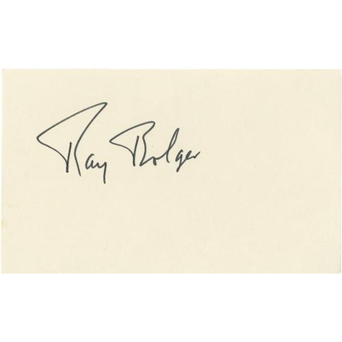 <B>Ray Bolger Autograph.</B></I> A 3" x 5" notecard signed by Bolger (the "Scarecrow" in <I>The Wizard of Oz</B></I>) in black ink, in Excellent condition with very mild tanning.<BR><BR><b>Shipping:</b> Flat Material, Small (<a target="_blank" href="http://www.heritageauctions.com/common/shipping.php">view shipping information</a>) <BR><BR><B>Important