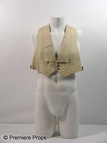 A Ray Bolger production made worn, beige 'United Costume' cropped vest ('United Costumes' tag inside). Contains three buttons with clips on the side for a belt.