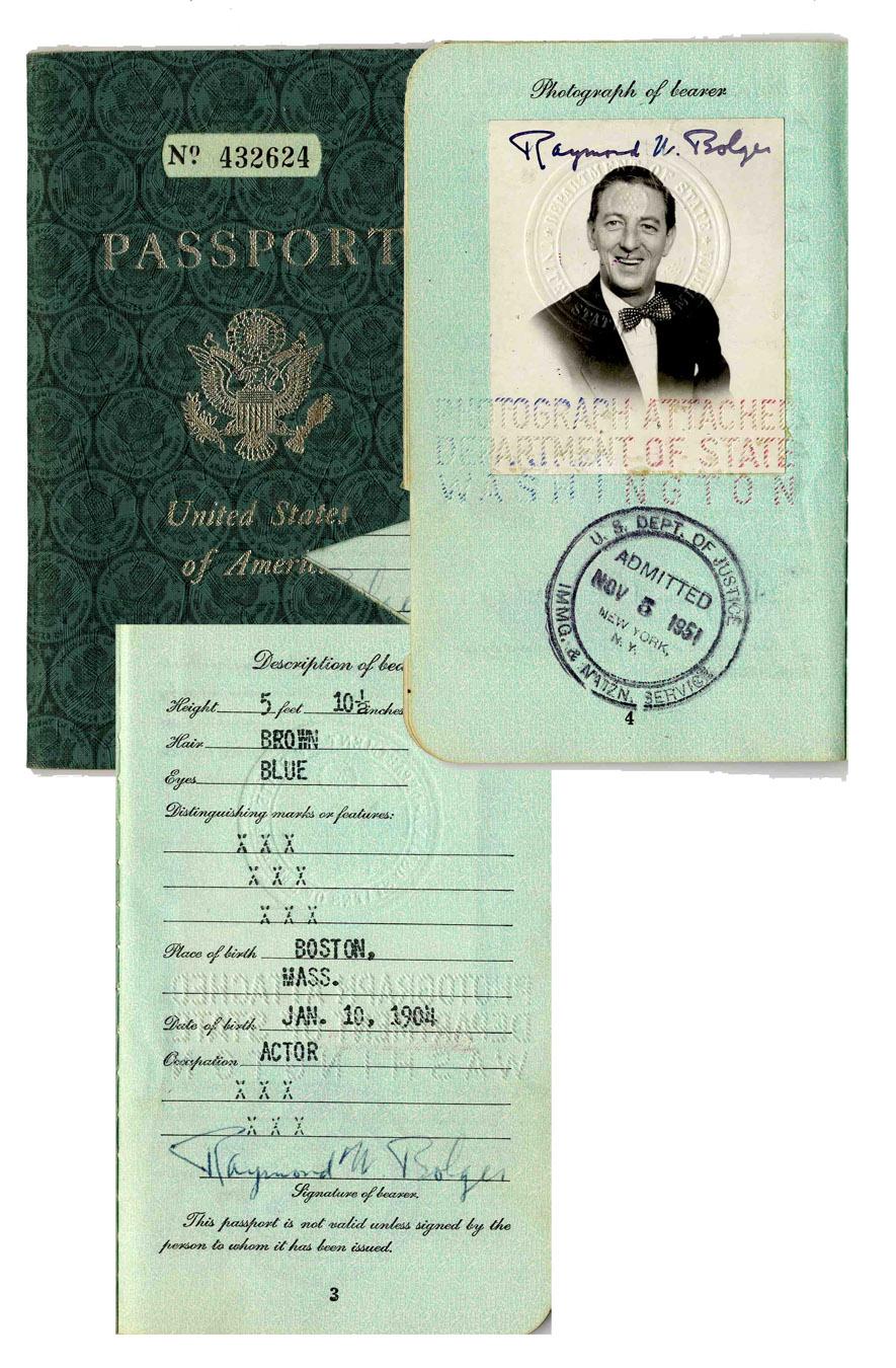Rare passport belonging to actor Ray Bolger, best known as the genial scarecrow in the 1939 film ''The Wizard of Oz.'' Issued 10 May 1951, passport is twice-signed, once on his 2.5'' x 3'' black and white passport photo and again as signature of bearer. Includes Bolger's personal information, various entry stamps and an interesting page detailing travel restrictions to Japan and Bulgaria during that time period. Passport measures 3.75'' x 6'' with a 1.5'' notch cut into the lower right edge of the cover and first page, else near fine.
