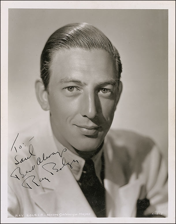 Very early vintage glossy 8 x 10 MGM publicity photo, signed and inscribed in-person in fountain pen “To:—Saul, Best always, Ray Bolger.” Reverse of photo bears collector’s stamp date of August 15, 1936, the date the signature was acquired. Scattered light bends and creases, a couple extending into facial area, and scattered light wear and rubbing to emulsion, otherwise fine condition. Saul Goodman Collection.
