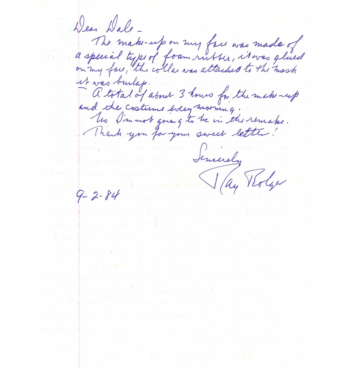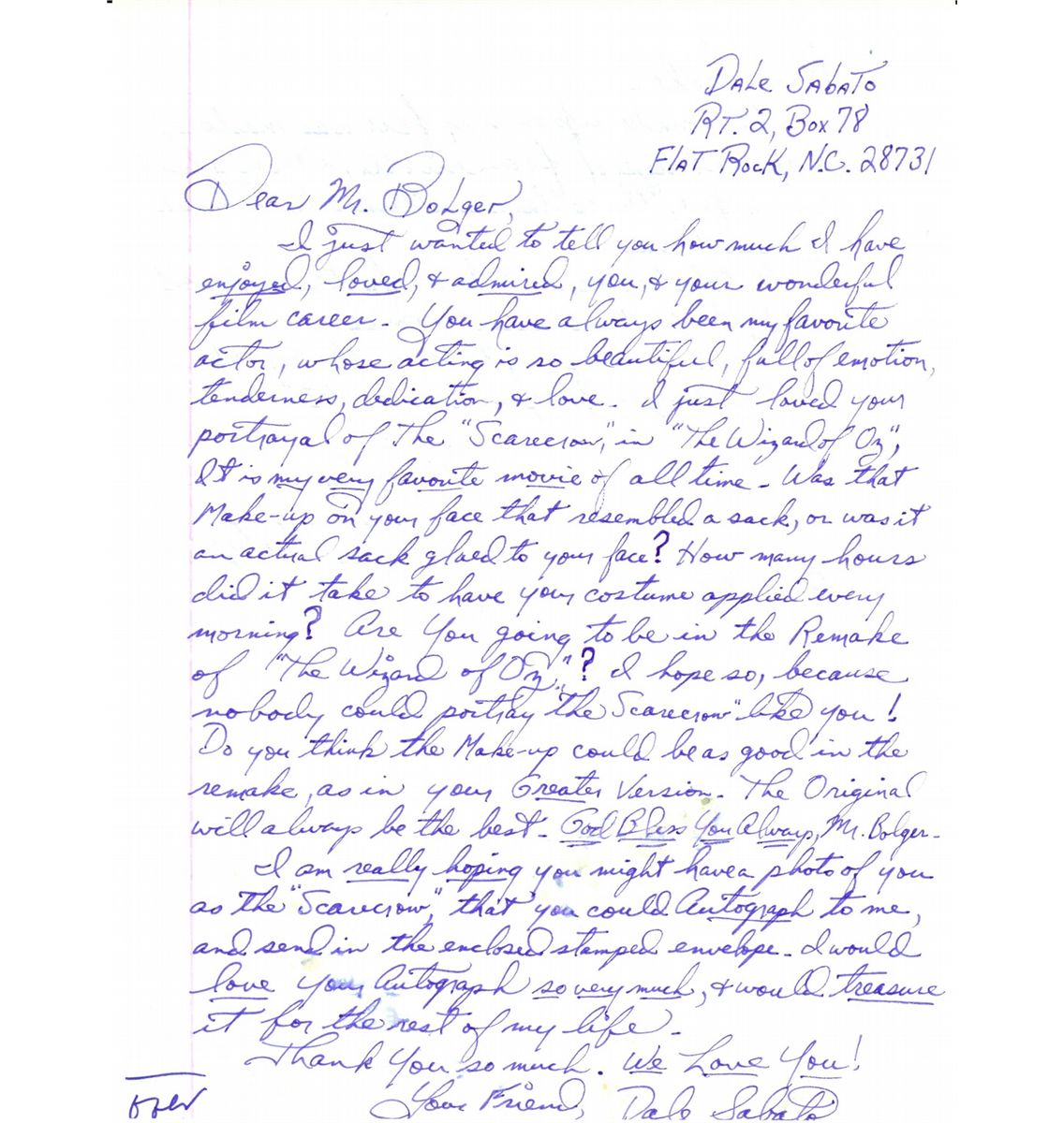 Ray Bolger, the "Scarecrow" in the "Wizard of Oz" autograph letter signed to a fan. It reads in full: "Dear Dale - The make-up on my face was made of a special type of foam rubber, it was glued on my face, the collar was attached to the mask it was burlap. A total of about 3 hours for the make-up and and the costume every morning. No I'm not going to be in the remake. Thank you for your sweet letter! Sincerely. Ray Bolger /9-2-84". Lot includes an 8" x 10" glossy photo of Bolger in costume as the Scarecrow. 1 pp. on ruled paper with original fan letter to verso. Measures 7.5" x 9.75". Near fine