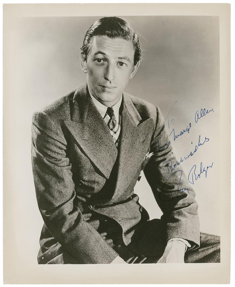 Dapper vintage glossy 8 x 10 photo of Bolger in a suit and tie, signed and inscribed in fountain pen “To Mrs. Marge Allen, Best wishes, Ray Bolger.” Surface impressions to top extending down into facial area, scattered creases, primarily to edges, and a few other surface impressions, otherwise fine condition.