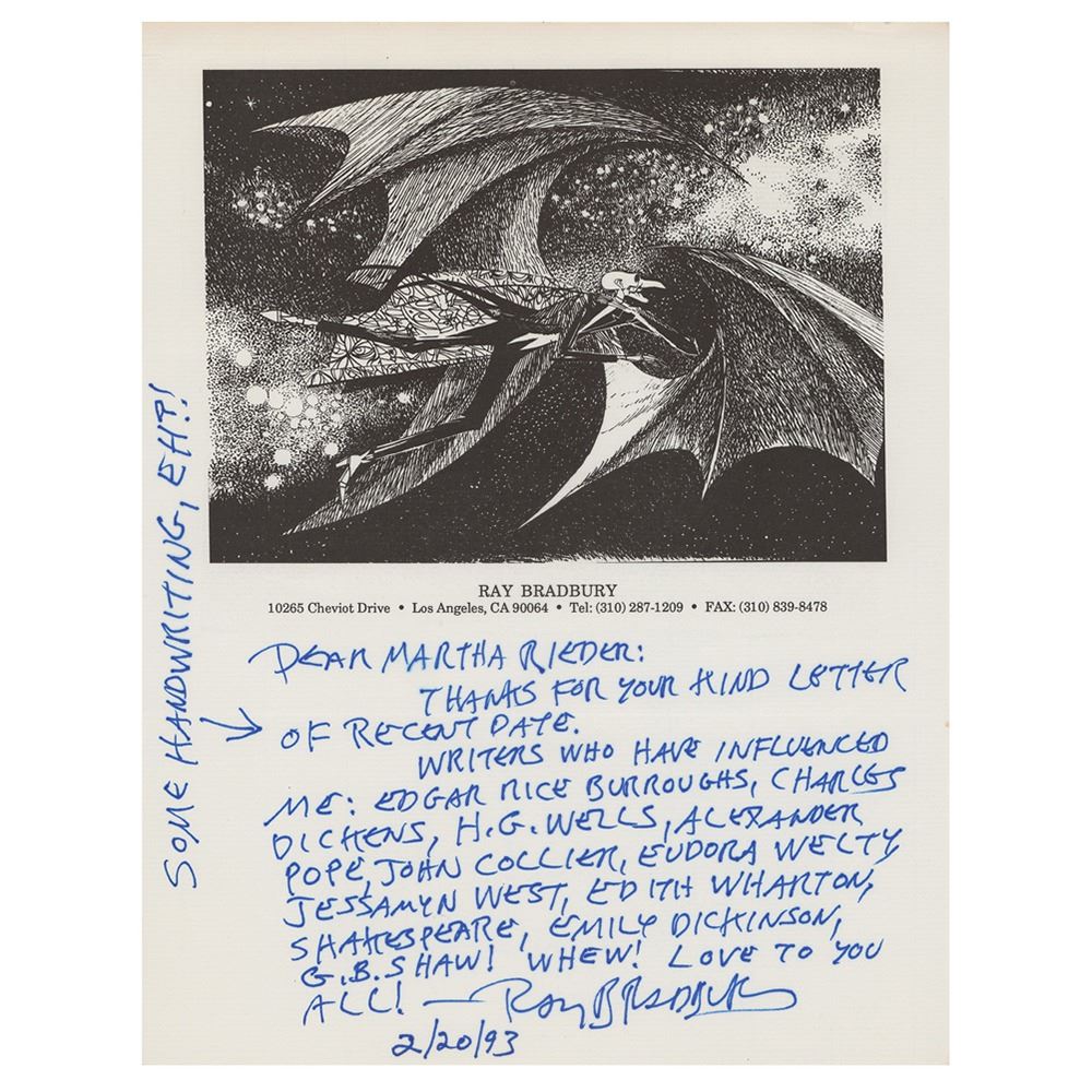 ALS, one page, 8.5 x 11, impressively illustrated personal letterhead, February 20, 1993. Handwritten letter on his literary influences, in part: "Writers who have influenced me: Edgar Rice Burroughs, Charles Dickens, H. G. Wells, Alexander Pope, John Collier, Eudora Welty, Jessamyn West, Edith Wharton, Shakespeare, Emily Dickinson, G. B. Shaw! Whew!" In fine condition.