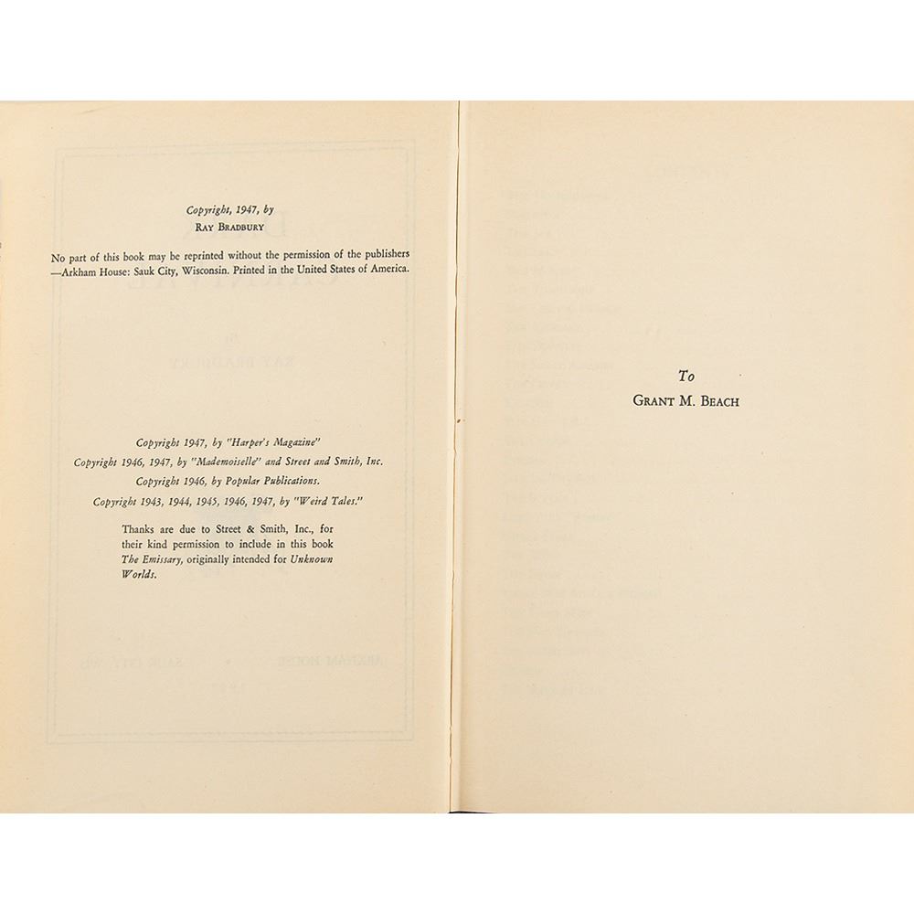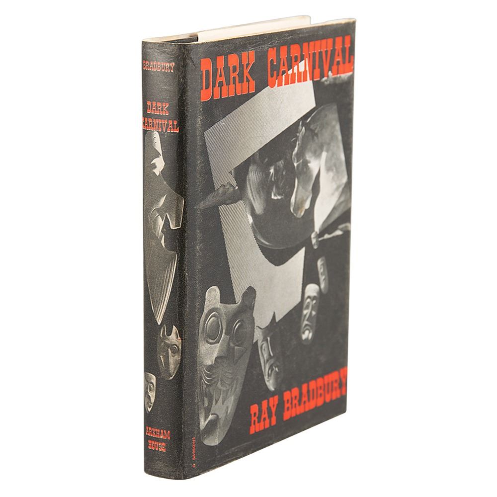 Unsigned first edition book: Dark Carnival. First edition. Sauk City, WI: Arkham House, 1947. Hardcover with dust jacket, 5.5 x 7.75, 313 pages. Book condition: VG+/NF, with light soiling to the rear panel of the unclipped jacket. Accompanied by a handsome, artistically crafted custom-made clamshell box. Bradbury's debut book was printed in an edition of 3,112 copies by Arkham House, under the editorial direction of August Derleth. A scarce and desirable example of the author's first book.