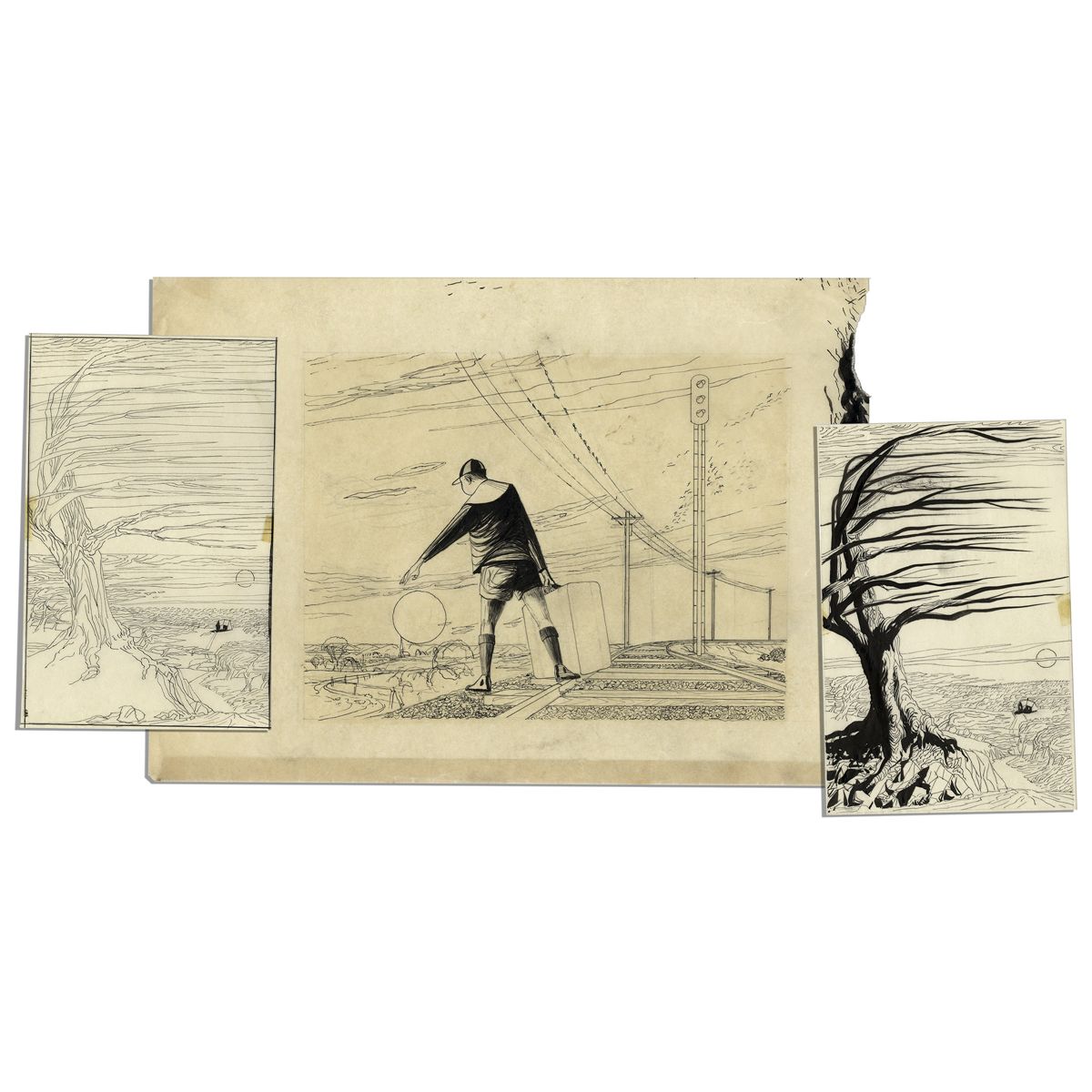 Lot of three Joseph Mugnaini drawings from the personal collection of Ray Bradbury. Drawings are custom created to illustrate Bradbury's works. The largest drawing is for Bradbury's short story ''Hail and Farewell'', published in ''The Golden Apples of the Sun''. Ink drawing on parchment depicts a man carrying a suitcase beside railroad tracks and underneath power lines. The other two ink drawings on parchment were specially made for the publication of Bradbury's story ''The Wind'' in his book ''The October Country'', both depicting a leafless tree withstanding a powerful gale, with all the limbs stylized to stretch horizontally. As preliminary concept pieces, the two drawings differ slightly from each other in terms of minor details, in addition to one drawing having been dramatically shaded. Drawing for ''Hail and Farewell'' measures 11'' x 8.5''. Toning and a chip to the right edge; very good condition. Each tree drawing measures 4'' x 6.5''. A tiny bit of tape to the right edges at center, else near fine. With a COA from the Ray Bradbury estate.