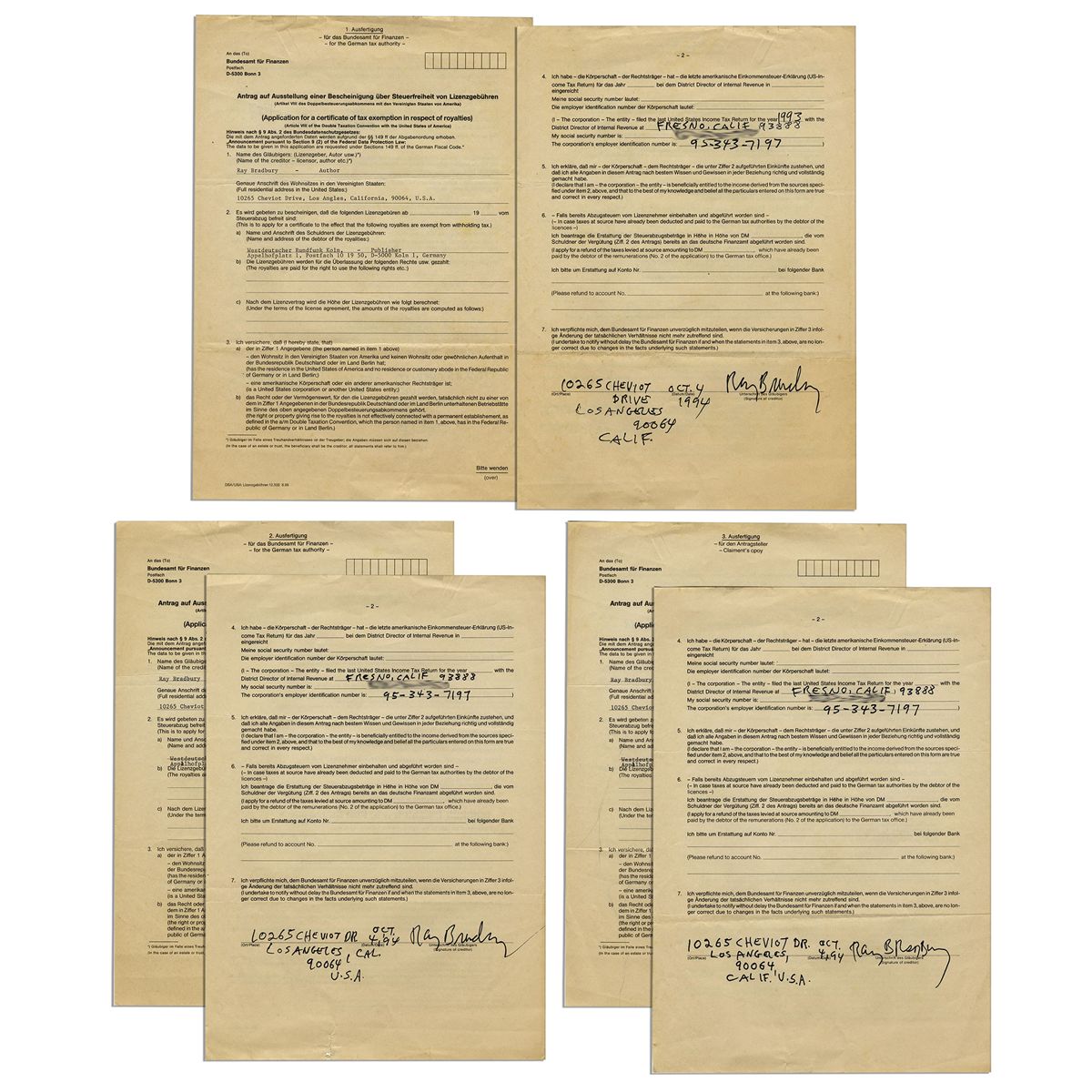 Three identical documents, each signed ''Ray Bradbury''. Partially-printed documents in German serve as applications for tax exemptions. Fields are typed and filled out in Bradbury's hand with his address, date of 1994 and other information. Each document runs 2pp., front and verso. Measures 8.25'' x 11.75''. Toning and tiny tears to top edge, else near fine. With a COA from the Ray Bradbury estate.
