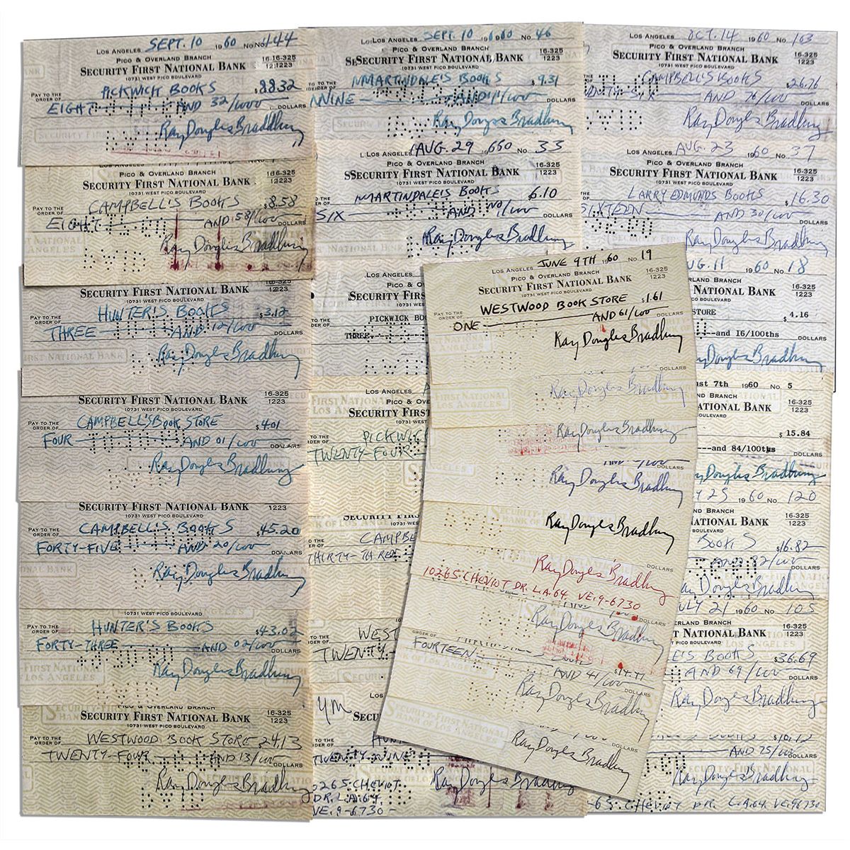 Lot of 30 checks signed, ''Ray Douglas Bradbury'' from 1960. Each Security First National Bank check is filled out in Bradbury's hand to a bookstore. Measures 6'' x 2.75''. Standard cancellations, otherwise near fine. With a COA from the Ray Bradbury estate.