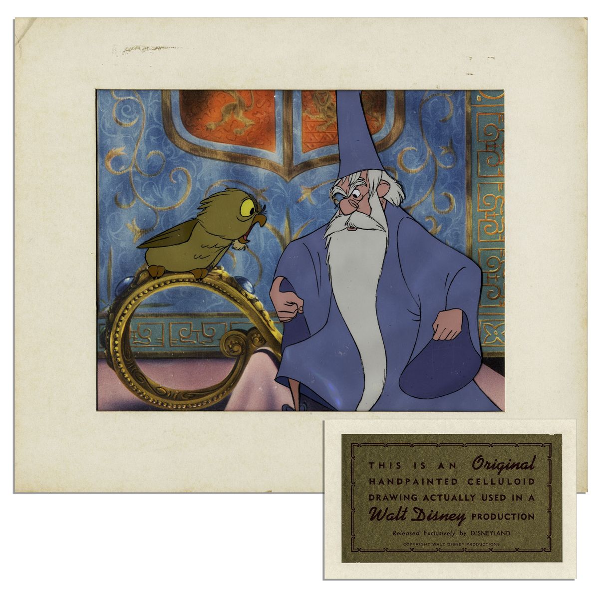 Ray Bradbury Owned Disney Cel From ''The Sword in the Stone'' -- Featuring Merlin & His Owl Archimedes -- Measures 14'' x 12'' -- Near Fine -- With Disney COA on Verso & COA From Estate