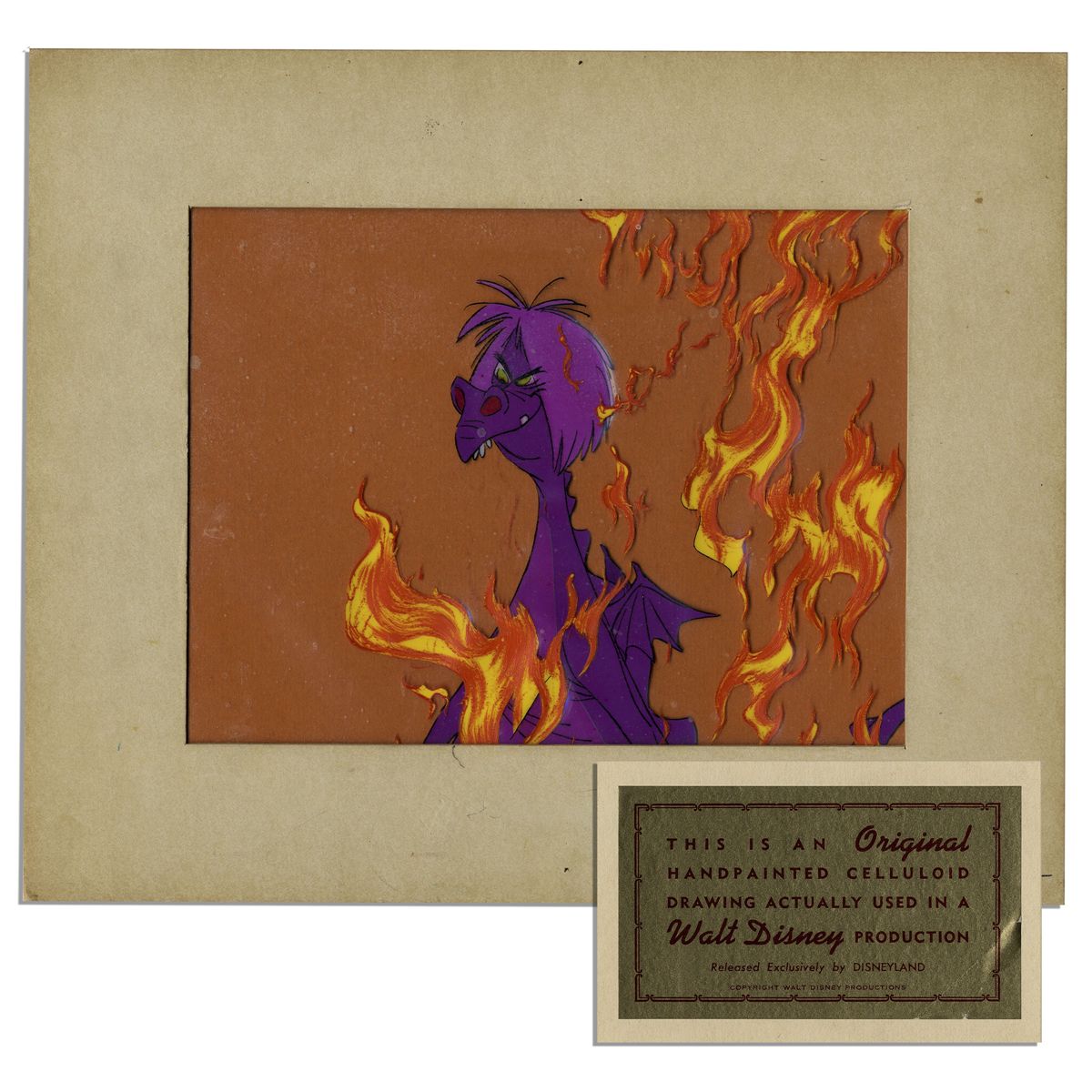Ray Bradbury Owned Disney ''Sword in the Stone'' Cel -- Depicting Madame Mim as a Dragon -- Matted Overall to 12'' x 10'' -- With Disneyland Sticker to Verso -- Near Fine -- COA From Estate