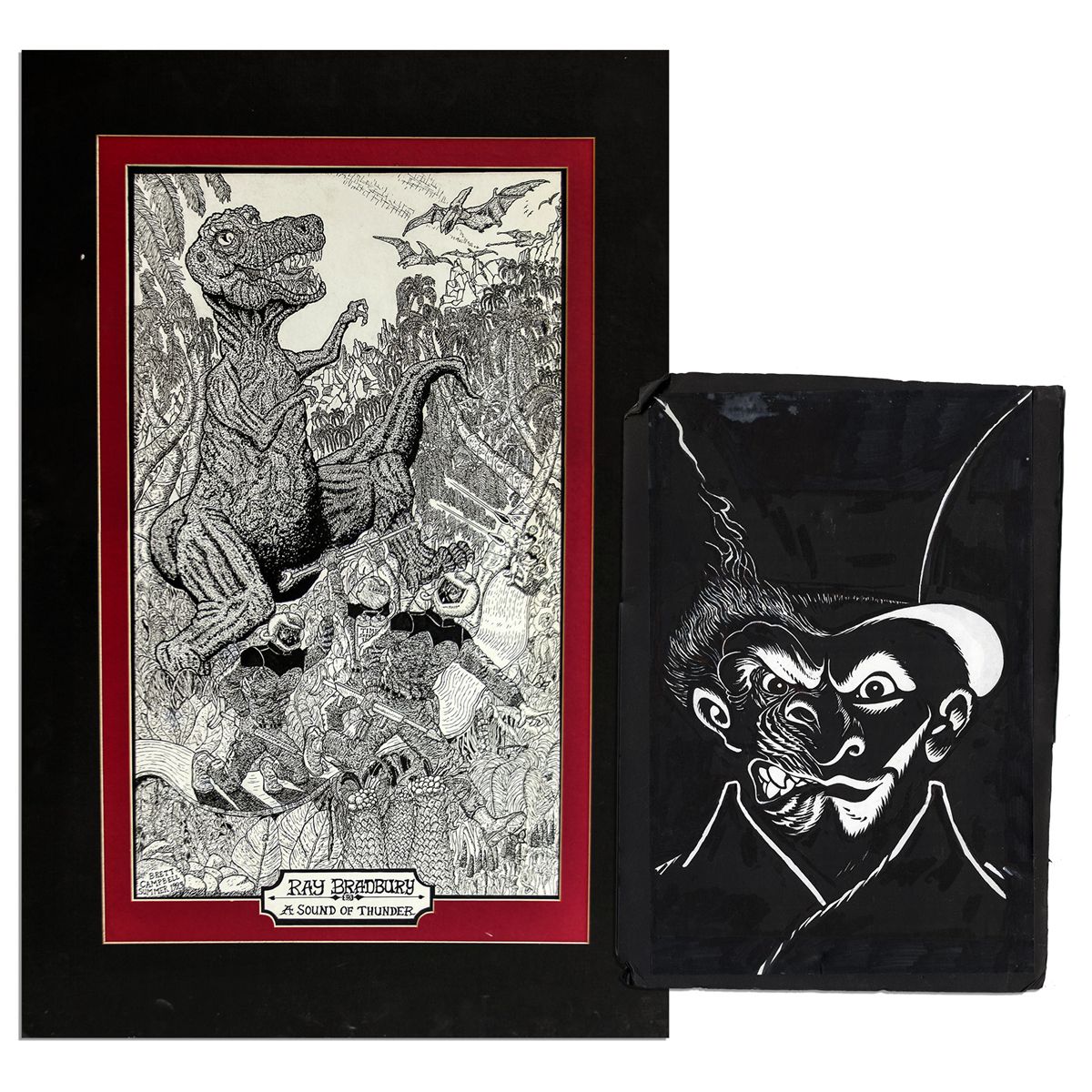 Ray Bradbury Owned Elaborate Ink Drawing Inspired by Bradbury's ''A Sound of Thunder'' -- Measures 23'' x 34.5'' -- Plus a White on Black Werewolf Picture -- Near Fine -- COA From Estate