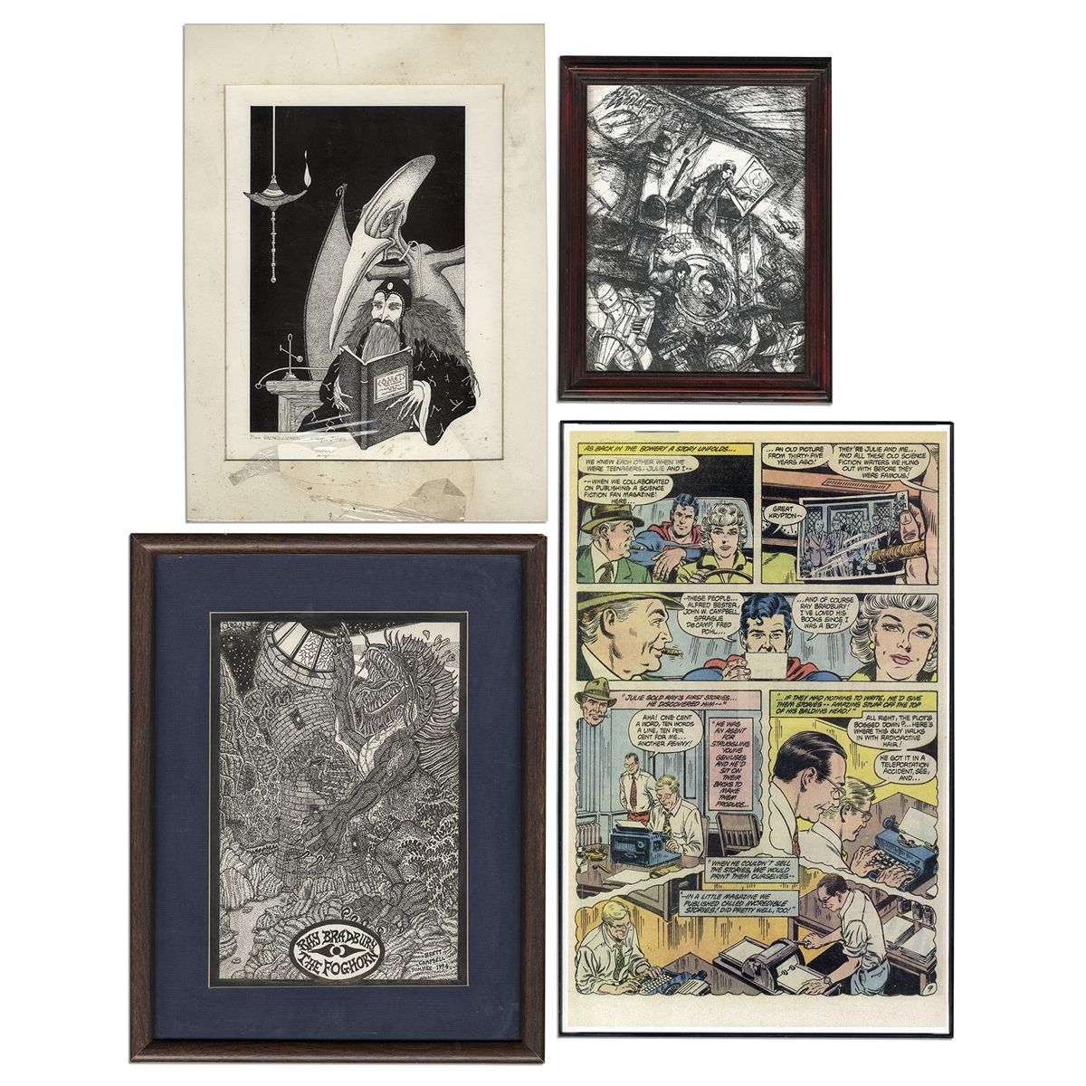 Ray Bradbury Owned Lot of 4 Artworks -- Framed Page From Superman Comic #411 Depicting a Young Ray Bradbury + 3 Fan Illustrations -- 11.25'' x 17.5'' -- Very Good -- With COA From Estate