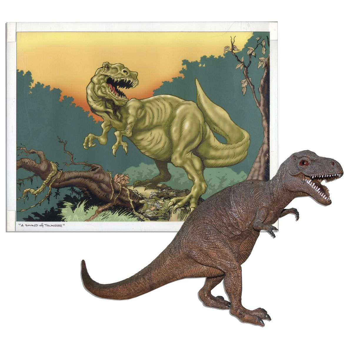 Ray Bradbury Owned Print Inspired by ''A Sound of Thunder'' & Dinosaur Figure -- Art Framed to 14.25'' x 11.25'', Dinosaur Measures 19.5'' From Nose to Tail -- Near Fine -- COA From Estate