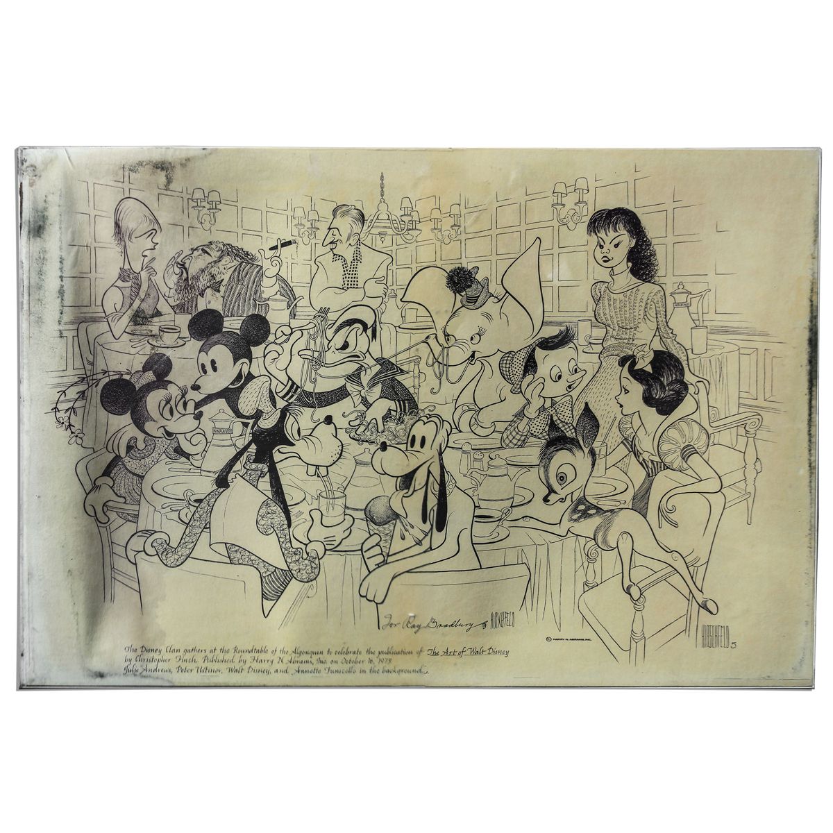Al Hirschfeld art signed and dedicated to Ray Bradbury, ''For Ray Bradbury / Hirschfeld''. The caricaturist's print depicts a crowd of Disney characters and actors ''...at the Roundtable of the Algonquin...'' Pictured are Mickey Mouse and Minnie, Goofy, Donald Duck, Pluto, Dumbo, Pinocchio, Bambi and Snow White, along with Walt Disney, Annette Funicello, Julie Andrews and Peter Ustinov. Amusing print shows the characters in various funny situations. Framed in Lucite, measuring 30'' x 22.25''. Toning, soiling to left edge and some fading, else very good. With a COA from the Ray Bradbury estate.