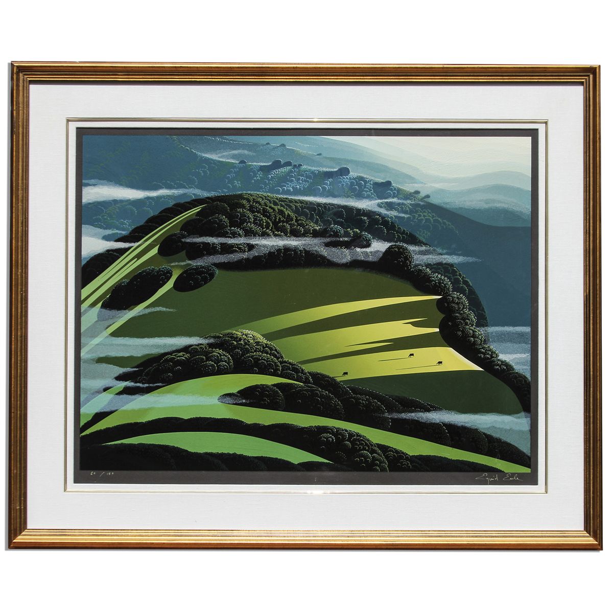 Limited edition silkscreen by Eyvind Earle, titled ''Beyond of the Valley'', from the personal collection of Ray Bradbury. Art is signed, ''Eyvind Earle'' at lower right, with edition number ''60/150'' at lower left. Earle's stylized, verdant landscape portrays rolling hills highlighted with beams of sunlight and low clouds of mist. Silkscreen on paper dates to 1997. Measures 30'' x 38'', framed to an overall size of 42'' x 35''. Near fine. With a COA from the Ray Bradbury estate.