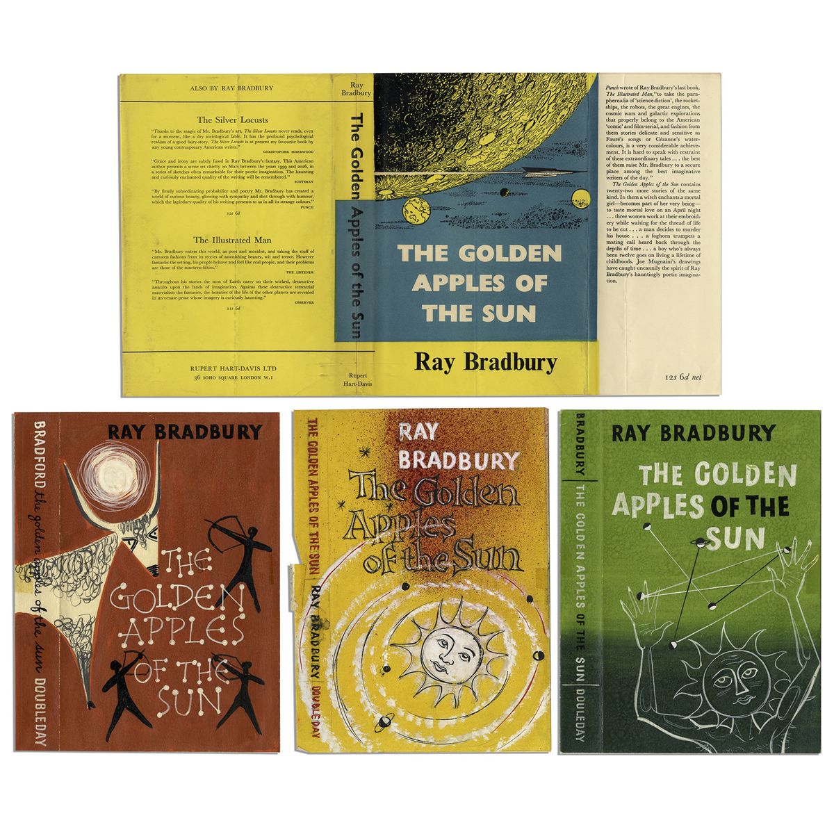 Lot of four different cover designs by Joseph Mugnaini for Ray Bradbury's book ''The Golden Apples of the Sun''. Three of the four pieces are original painted sheets, with two of the designs featuring the same sunburst-face that ultimately became the cover art for the first edition. The fourth cover is a printed dustjacket sample from the Rupert Hart-Davis edition. All measure approximately 6'' x 8''. Creasing, else near fine. With a COA from the Ray Bradbury estate.