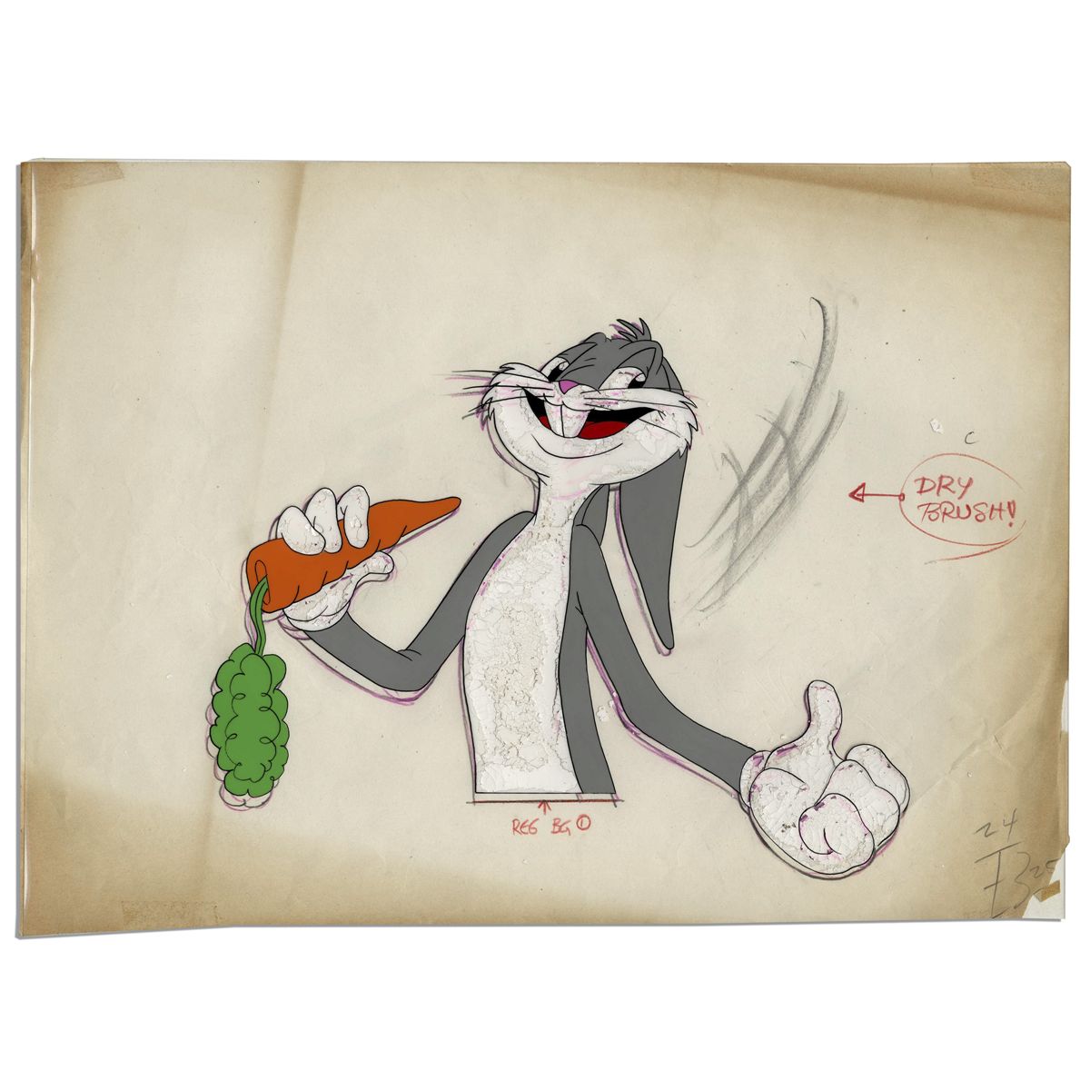 Ray Bradbury personally owned Bugs Bunny animation cel by Warner Bros. Bugs grins with ears pressed back against his head, his everpresent carrot in his right hand. Cel is matted on top of a matching sketch in pencil and fuchsia colored pencil. Measures 12.5'' x 9.25''. Cel shows cracking, a good deal of chipping and transfer of pink in some places from the sketch. Good condition. With a COA from the Ray Bradbury estate.