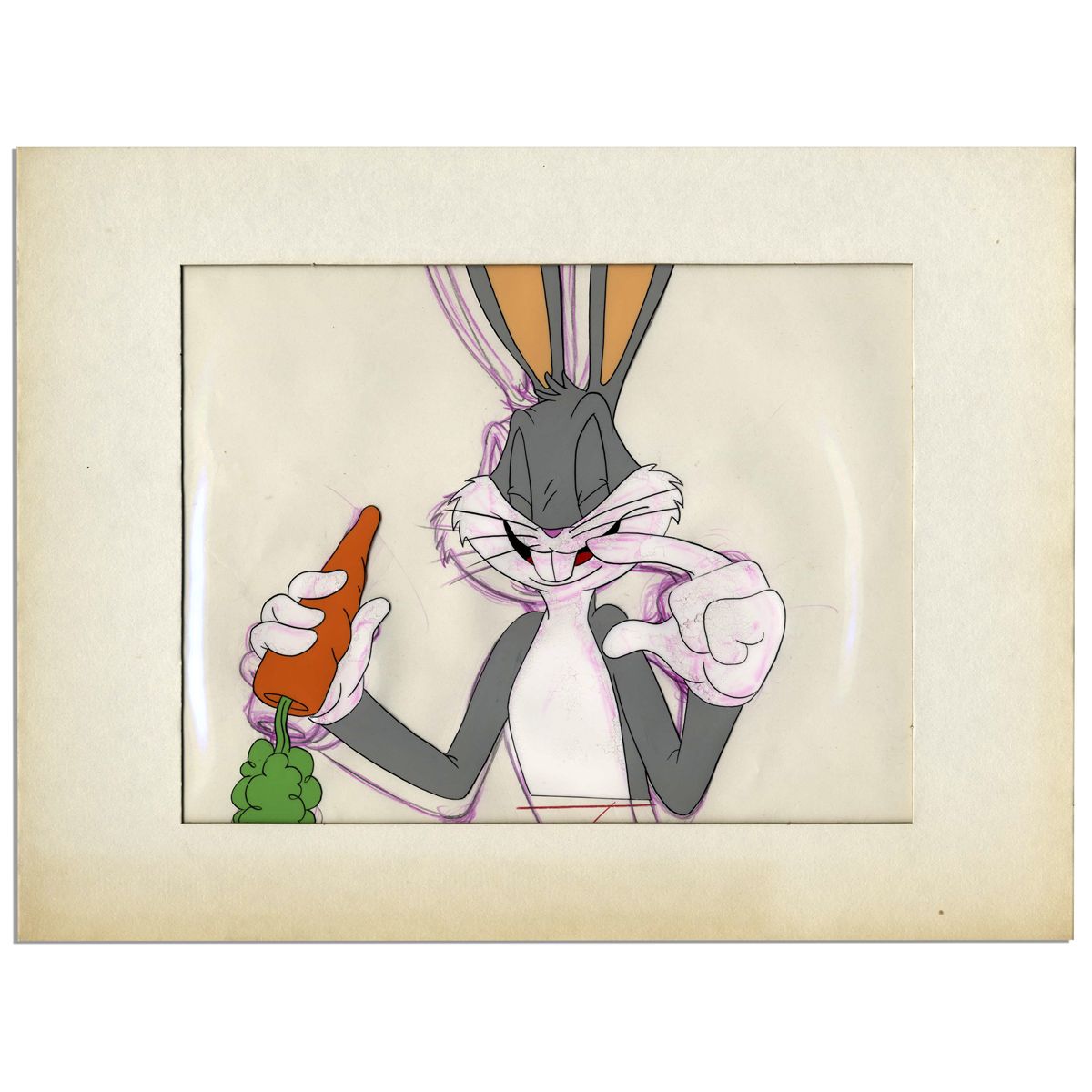 Ray Bradbury personally owned Bugs Bunny animation cel by Warner Bros. Bugs grins with shut eyes, his everpresent carrot in his right hand. Cel is matted on top of a matching sketch in pencil and fuchsia colored pencil. Measures 12.5'' x 9.25''. Cel shows cracking, chipping and transfer of pink in some places from the sketch, overall very good. With a COA from the Ray Bradbury estate.