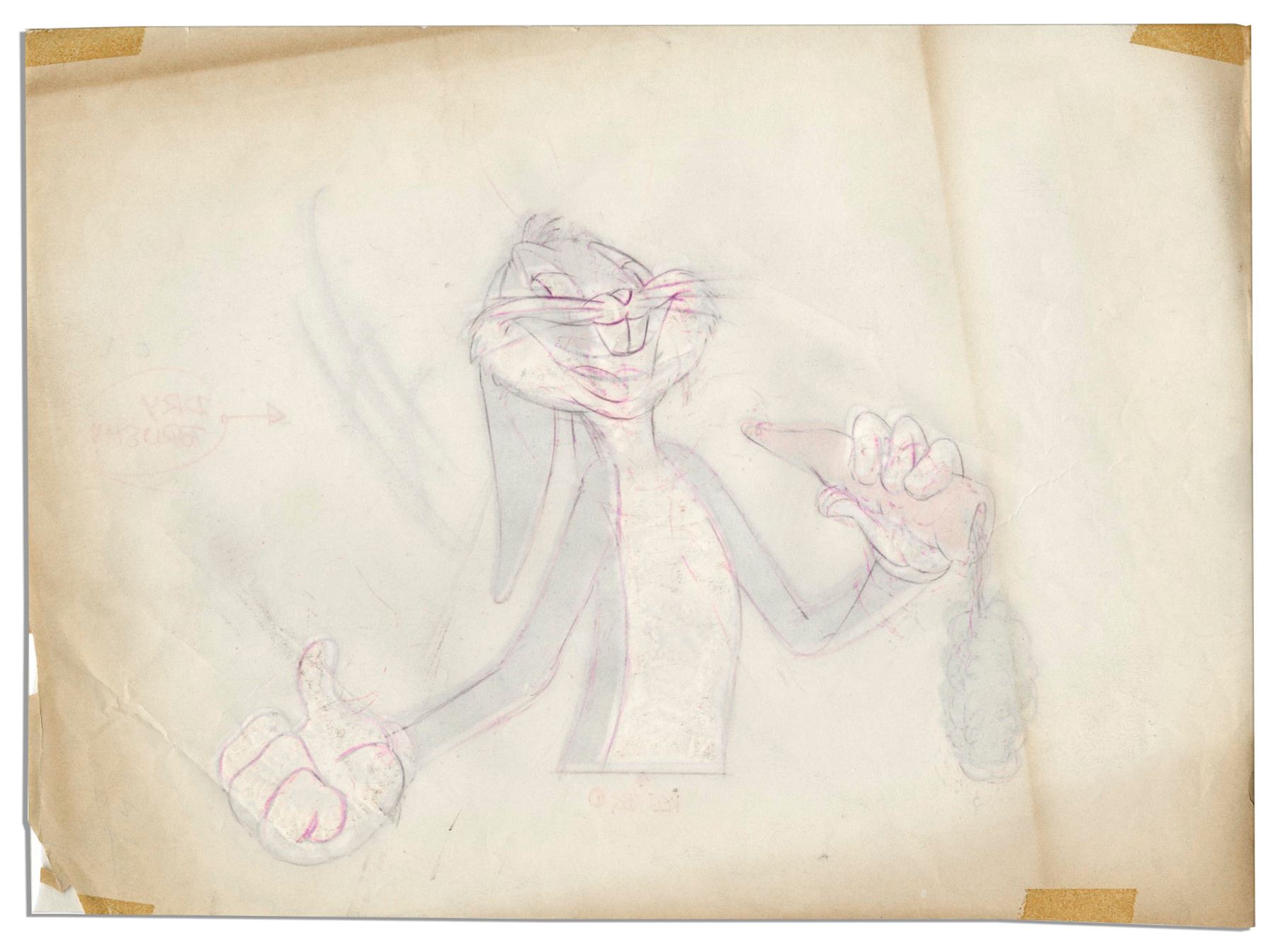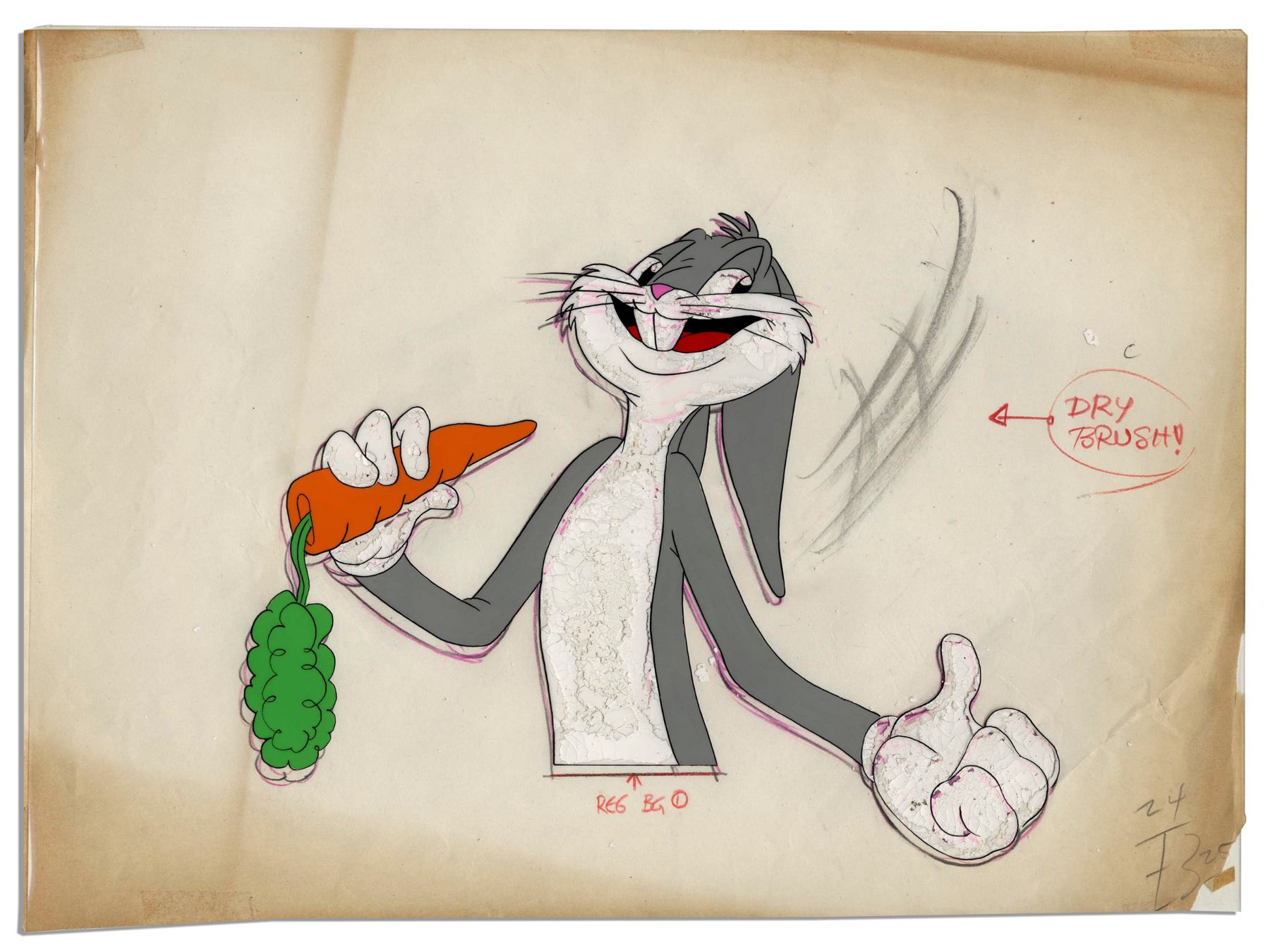 Ray Bradbury personally owned Bugs Bunny animation cel by Warner Bros. Bugs grins with ears pressed back against his head, his everpresent carrot in his right hand. Cel is matted on top of a matching sketch in pencil and fuchsia colored pencil. Measures 12.5'' x 9.25''. Cel shows cracking, a good deal of chipping and transfer of pink in some places from the sketch. Good condition. With a COA from the Ray Bradbury estate.