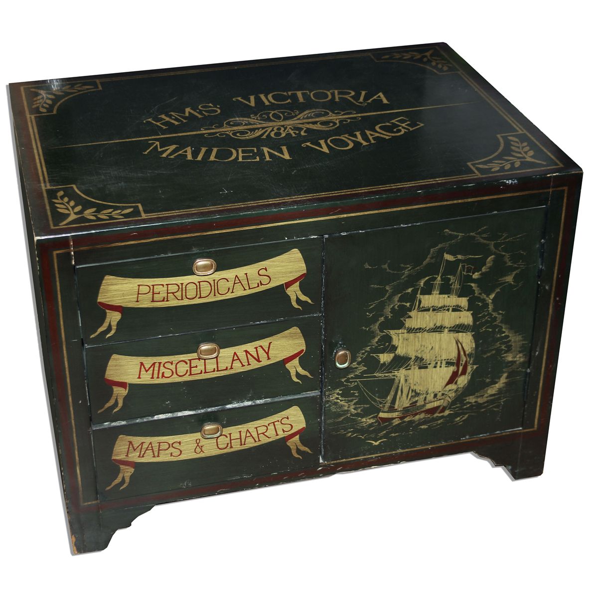 Ray Bradbury chest of drawers. Dark green chest is ornately painted with the HMS Victoria ship to front and various pieces of luggage and provisions to back. Each drawer itemizes belongings, including ''Periodicals'', ''Miscellany'' and ''Maps & Charts''. ''HMS Victoria Maiden Voyage'' is painted to top. Measures 28'' x 21'' x 20'' deep. Some minor wear, else very good. With a COA from the Ray Bradbury estate.