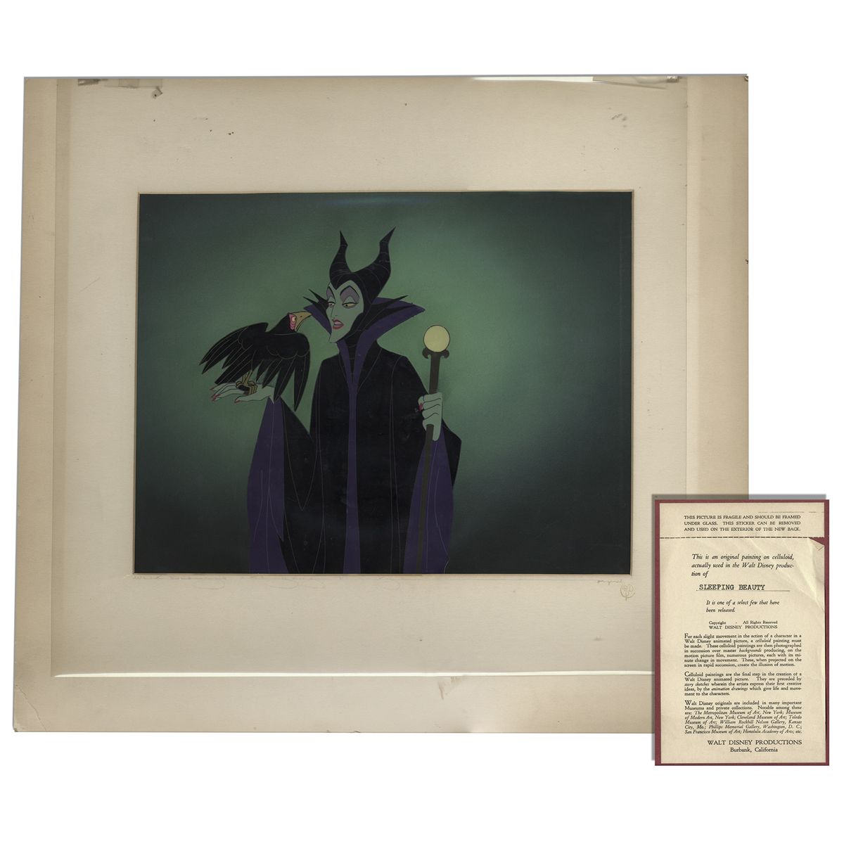 Ray Bradbury's Disney animation cel of Maleficent from ''Sleeping Beauty''. Cel depicts the 1959 film's notorious villainess looking appropriately devious, her raven sidekick Diablo perched on her hand. Hand-painted cel is cut out precisely and mounted to an illustrated background. Actual art measures 6.75'' x 8.5''. Mounted and matted to an overall size of 18.5'' x 16.5''. Tiny chip to black paint on Maleficent's head and toning to mat, else near fine. With Disney COA stamp to right corner and Disney COA sticker to verso. With a COA from the Ray Bradbury estate.