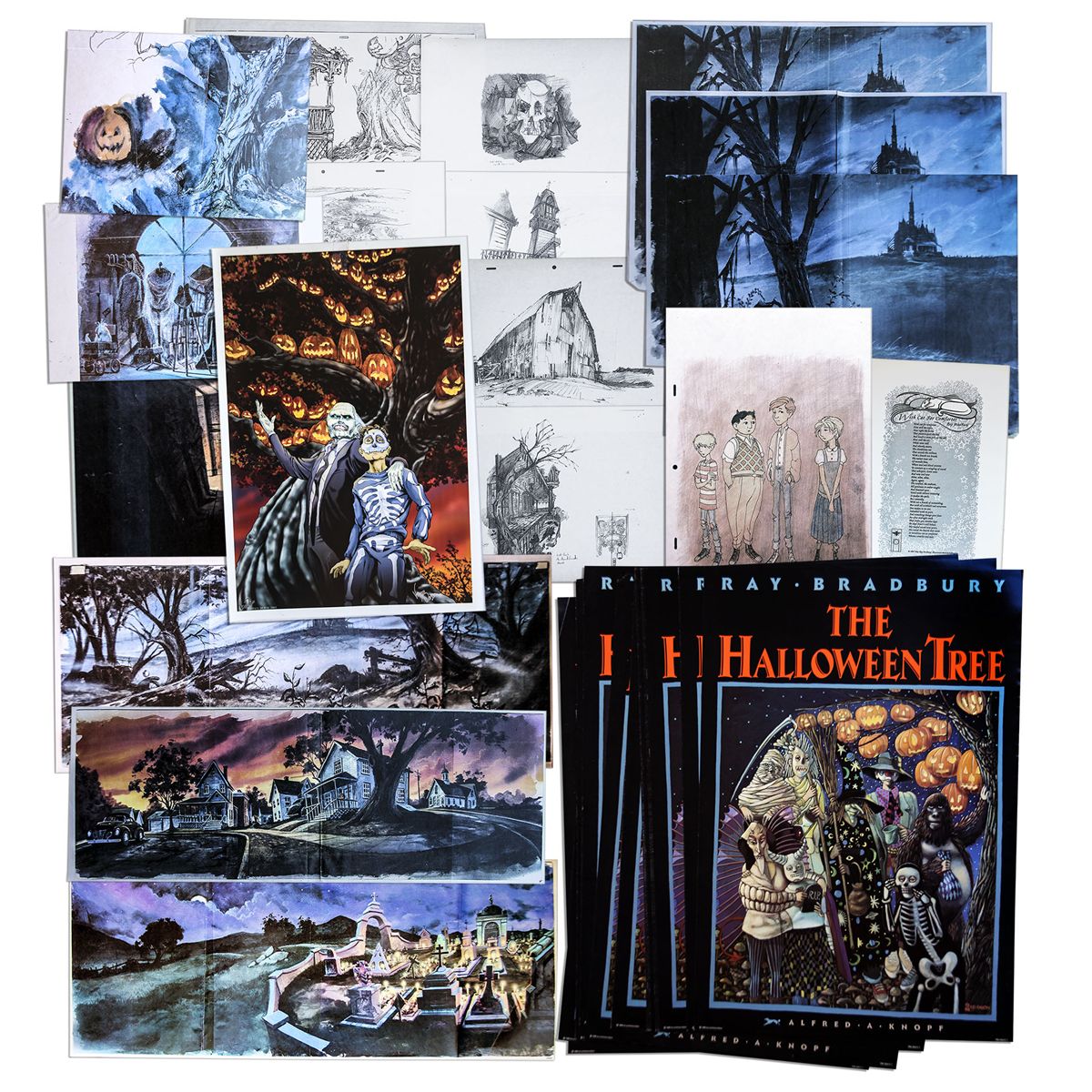 Ray Bradbury personally owned folio of ''The Halloween Tree'' concept art. Includes a large collection of color copies of drawings and paintings from the 1972 fantastical novel, illustrated by Joseph Mugnaini. Includes: (1) 29 copies of watercolor and ink drawings of various houses and landscapes in the book, in varying sizes, with the larger rectangular pieces measuring 43'' x 11''; (2) 9 pencil and ink drawings, 17'' x 11''; (3) 45 posters of the book cover, 15'' x 22'', (4) 14 additional color copies of illustrations from the book, mostly 13'' x 19''. Housed in original black portfolio case measuring 24.5'' x 19.5''. Overall, near fine. With a COA from the Ray Bradbury estate.