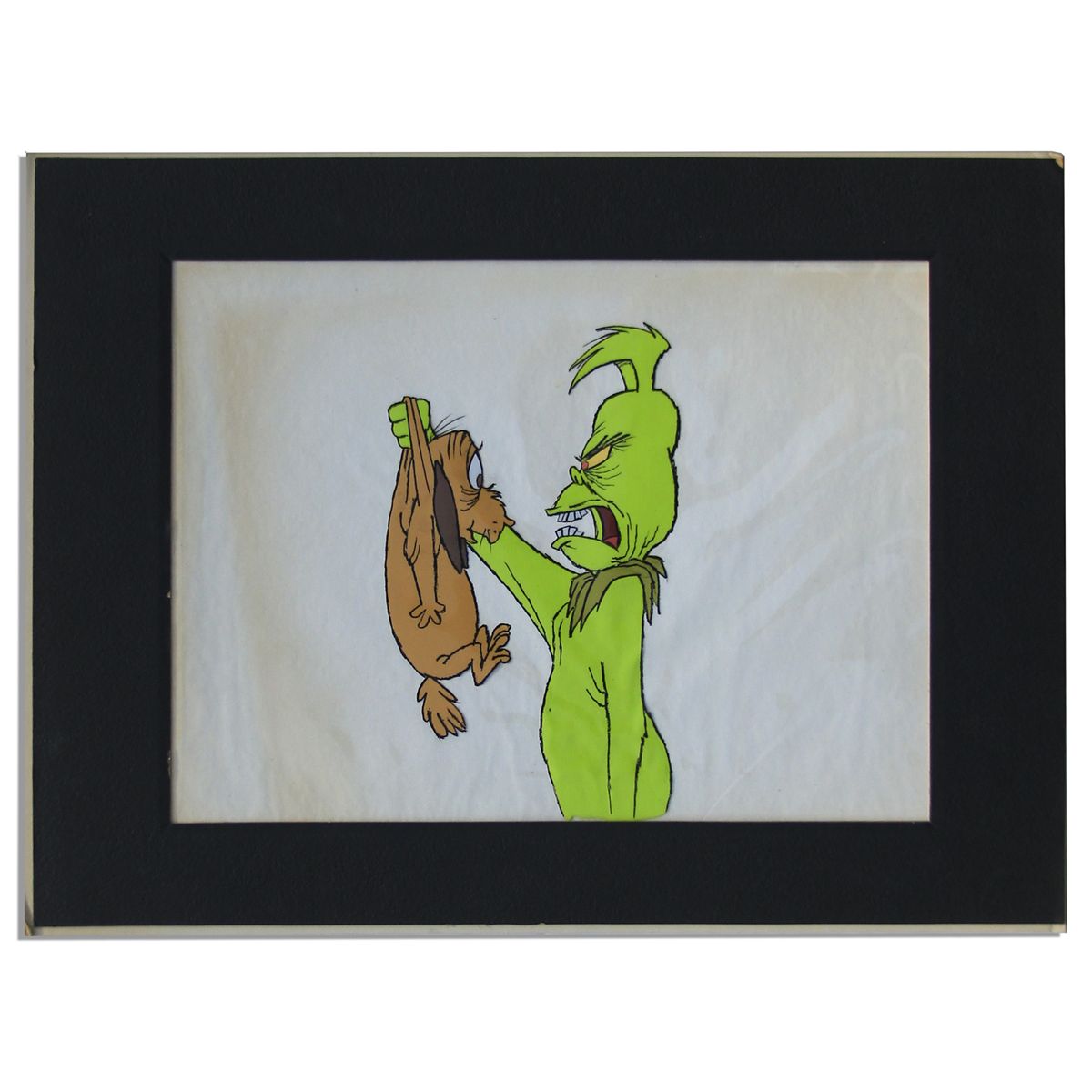 Animation cel from Dr. Seuss' ''How The Grinch Stole Christmas''. The infamous Grinch holds his little dog Max up by the scruff. Hand-painted cel is matted to an overall size of 15.75'' x 11.5''. Toning to plain background and felt tip notation to verso, else near fine. With a COA from the Ray Bradbury estate.