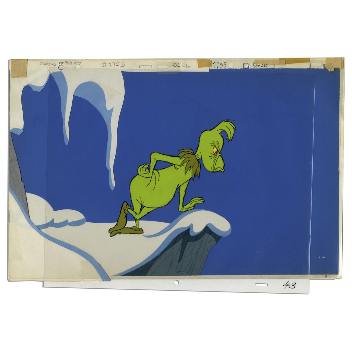 Animation cel from Dr. Seuss' ''How The Grinch Stole Christmas''. The infamous Grinch peers grumpily over the snowy edge of a cliff, likely at the Whoville population below. Hand-painted cel is stapled to an illustrated background with reference numbers along the top edge. Measures 15.75'' x 10.5''. Some loss of boldness to black outlines, else near fine. With a COA from the Ray Bradbury estate.
