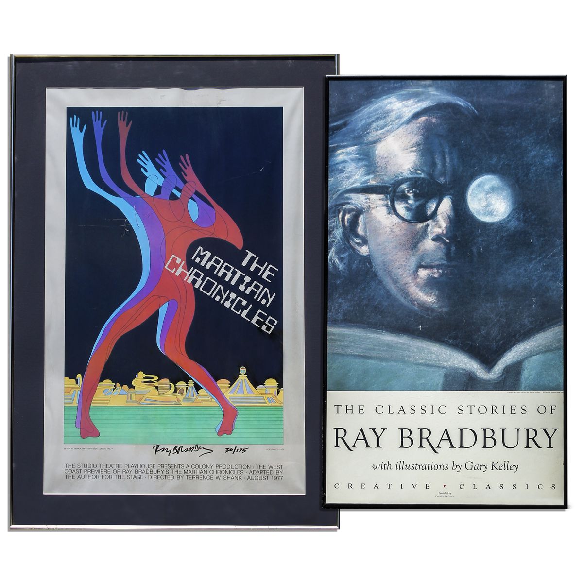 Limited edition poster from the stage performance of Ray Bradbury's ''The Martian Chronicles''. Signed, ''Ray Bradbury / 30/175''. Captioned in print, ''The Studio Theatre Playhouse presents a Colony Production - the West Coast premiere...adapted by the author for the stage - Directed by Terrence Shank - August 1977''. Art is by Patrick Duffy Whitbeck and Conrad Wolff. Lot also includes a poster promoting a Bradbury anthology published by Creative Education. Signed poster is framed to an overall size of 24.25'' x 35.25''. Anthology poster is framed to 18'' x 32.25''. Some very light buckling to signed poster, else near fine. Light toning to second poster, else near fine. With a COA from the Ray Bradbury estate.