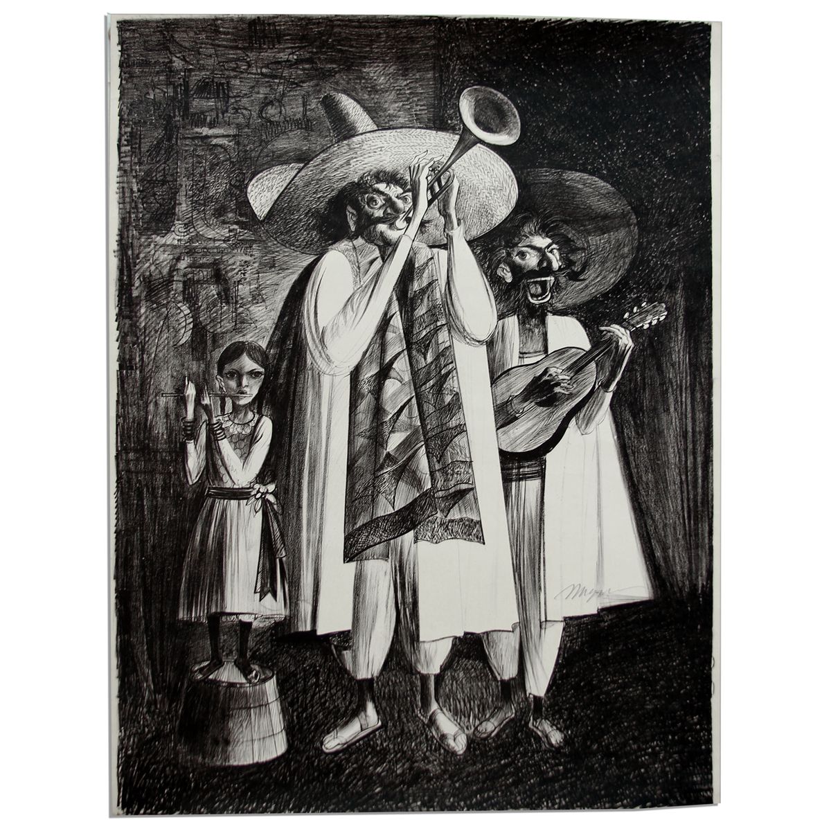 Ray Bradbury personally owned Joseph Mugnaini lithograph, depicting a mariachi trio band. Signed by Mugnaini on the front of the guitar player's poncho. Joseph Mugnaini was a personal favorite of Bradbury's, and the artist designed the cover art for many of Bradbury's novels. Measures 20'' x 25.75''. Near fine. With a COA from the Bradbury estate.
