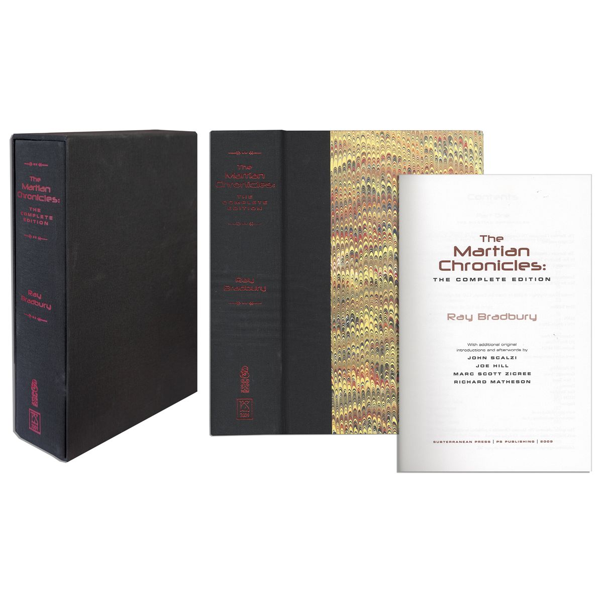 Beautiful luxury edition of Ray Bradbury's tome, ''The Martian Chronicles'', published by the Subterranean Press: Burton, Michigan: 2009. Bradbury's beloved fantasy work is based on the concept of humans colonizing Mars, a planet already populated with native Martians. Book is bound in marbled paper boards in ochre tones with a black cloth spine featuring metallic red lettering. Housed in a black cloth slipcase with red metallic lettering. Runs 745pp. Measures 7.25'' x 10.25'' x 2.5''. Fine. Accompanied by art depicting Mr. K in Act 1 of the story. With a COA from the Ray Bradbury estate.
