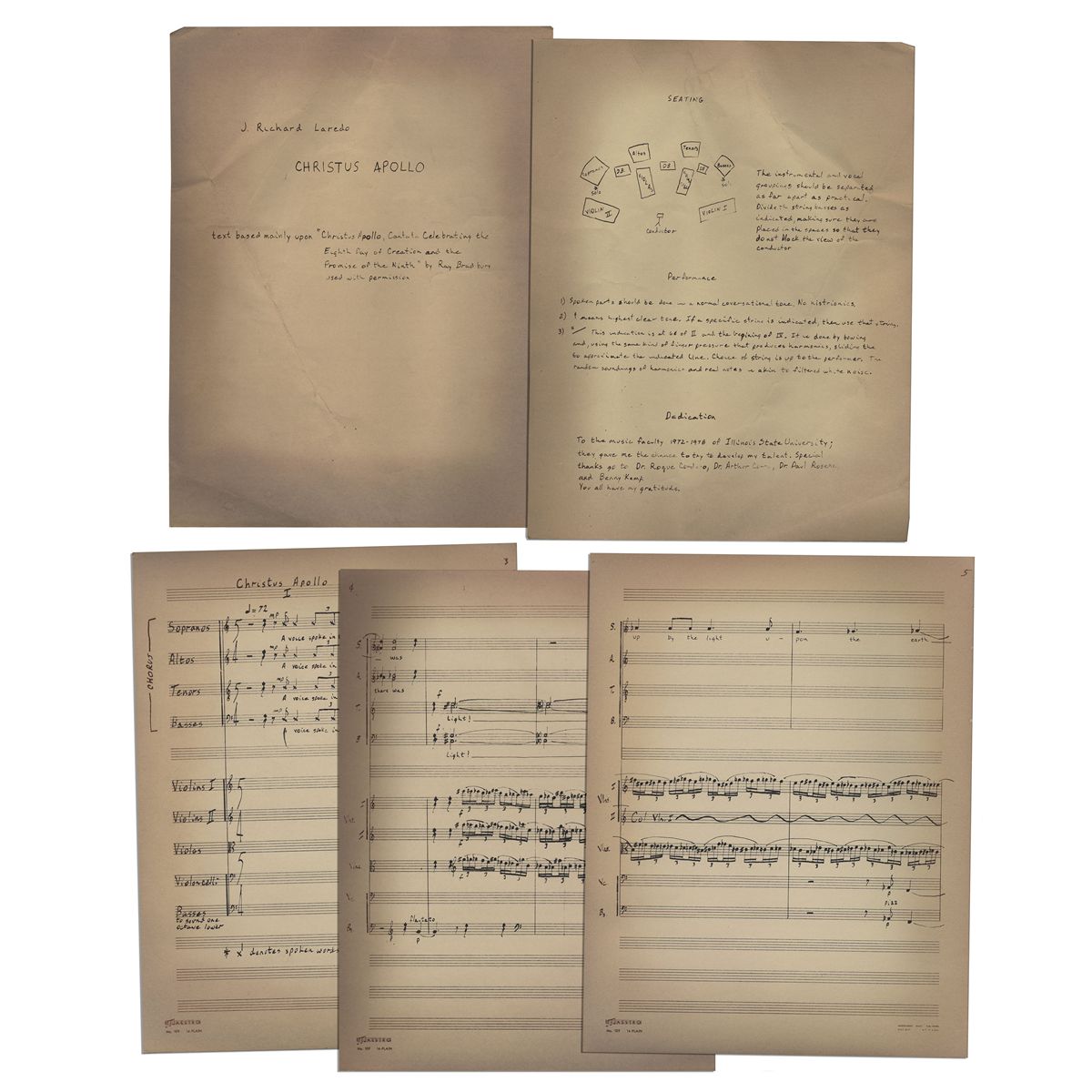 Ray Bradbury personally owned sheet music for a cantata incorporating the author's text, ''Christus Apollo: Cantata Celebrating the Eighth Day of Creation and the Promise of the Ninth''. Bradbury wrote ''Christus Apollo'' in 1969 and the California Chamber Symphony performed the cantata, setting music to Bradbury's text. This sheet music was penned by a J. Richard Laredo, who received permission to use the text. Cover page reads, ''J. Richard Laredo / Christus Apollo / text based mainly upon 'Christus Apollo, Cantata Celebrating the Eight Day of Creation and the Promise of the Ninth' by Bradbury / used with permission''. Verso describes the performance visually and in detail with a dedication to various professors at Illinois State University, where the composer presumably studied. Sheet music has notes hand-drawn with the narration of the cantata written below notes. 96pp. in total, front and verso, each sheet loose and unbound. Measures 11'' x 14.25''. Toning throughout, overall very good. With a COA from the Ray Bradbury estate.