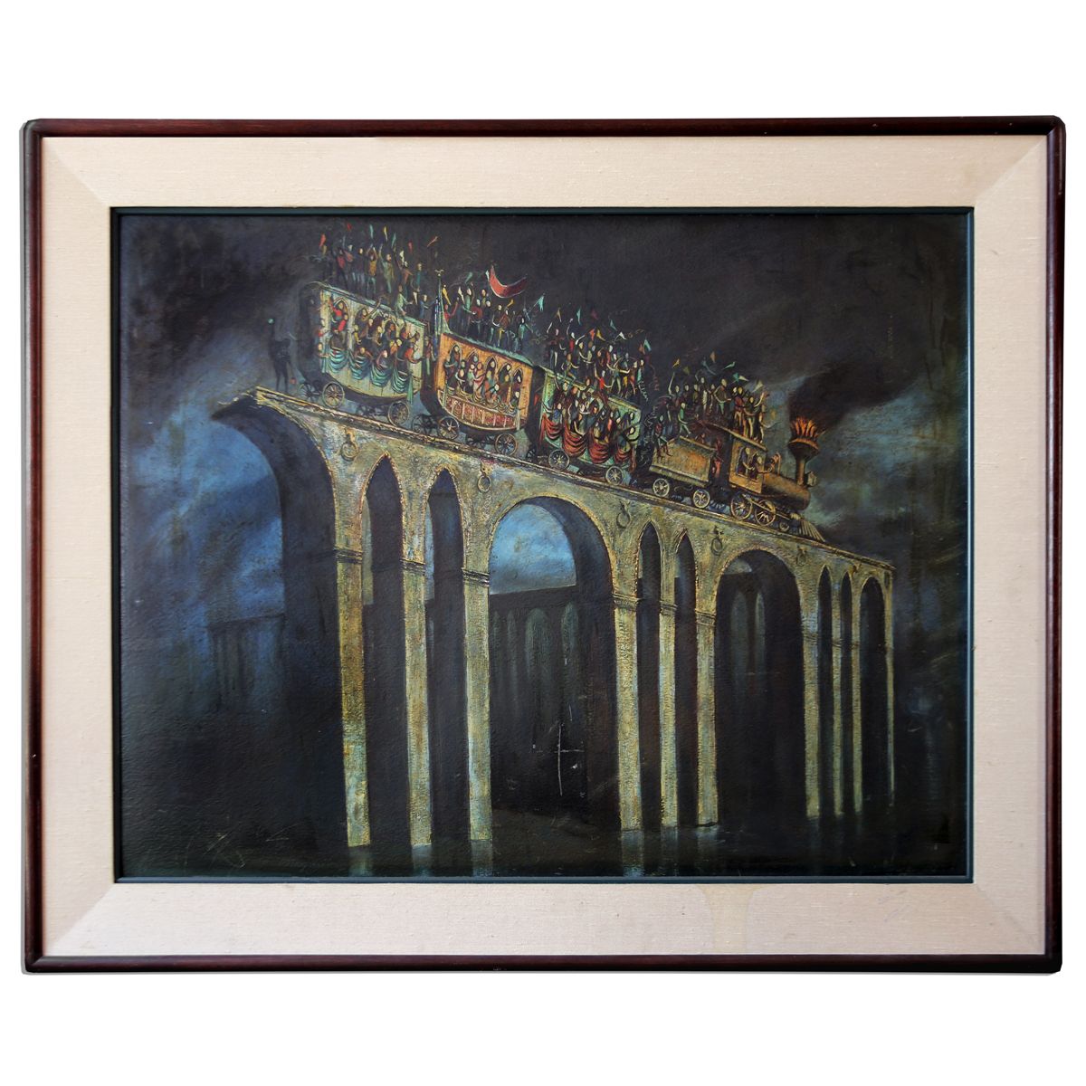 Art by Joseph Mugnaini from the personal collection of Ray Bradbury, and indeed the painting which began the collaboration between the two creative men. Painting titled, ''Carnival'' is a nighttime scene depicting a train perched precariously high, filled with faceless figures, their arms raised in apparent cheering, waving pennant-style flags. The carnival theme is inextricable from Bradbury's work, serving not only as the setting of his famous novel, ''Something Wicked This Way Comes'', but also as his inspiration to become a writer; Bradbury credits his interaction as a child with a carnival magician named ''Mr. Electrico'', who told him to ''Live Forever!'', as the impetus for his writing career. Painting, composed in oil on board, is circa 1952. Measures approximately 31'' x 25'', matted and framed to an overall size of 36'' x 30''. Frame shows wear but art appears near fine. With a COA from the Ray Bradbury estate.