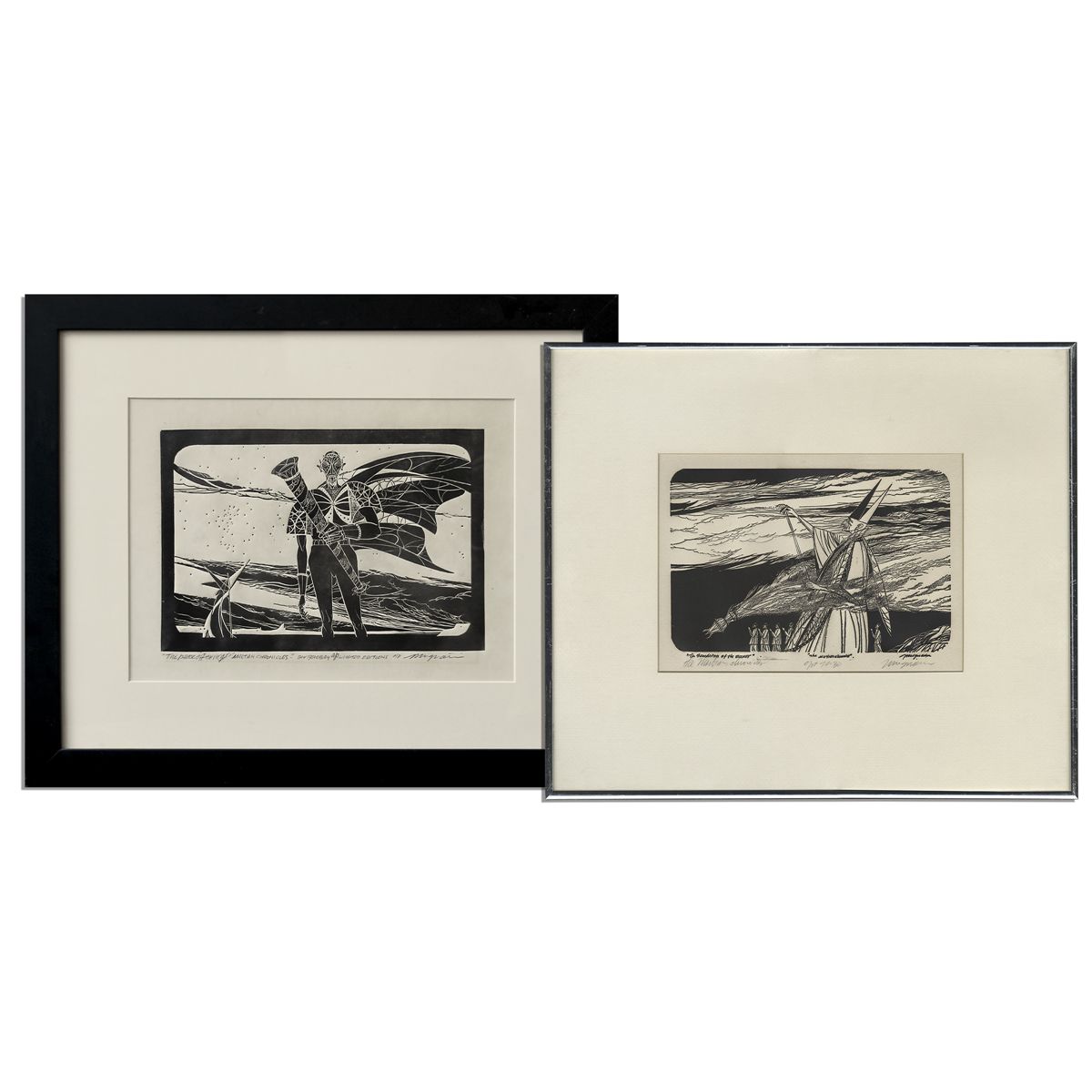 Ray Bradbury personally owned art by Joseph Mugnaini for ''The Martian Chronicles''. According to a typed label affixed to verso of one of the frames, these scenes were used as chapter headings in Bradbury's popular book. Lot comprises 2 framed relief prints of ''The Peace Offering'' and ''The Benediction of the Rocket'', both titled ''Martian Chronicles'' and signed in pencil by the artist. The former depicts a figure wearing a cape and wielding a large, cannon-like object. The latter is of a priest in robes, appearing to oversee a rocket explosion. Prints are matted and framed to an overall size of 20'' x 16.5'' and 19.25'' x 16.25''. Near fine. With a COA from the Ray Bradbury estate.