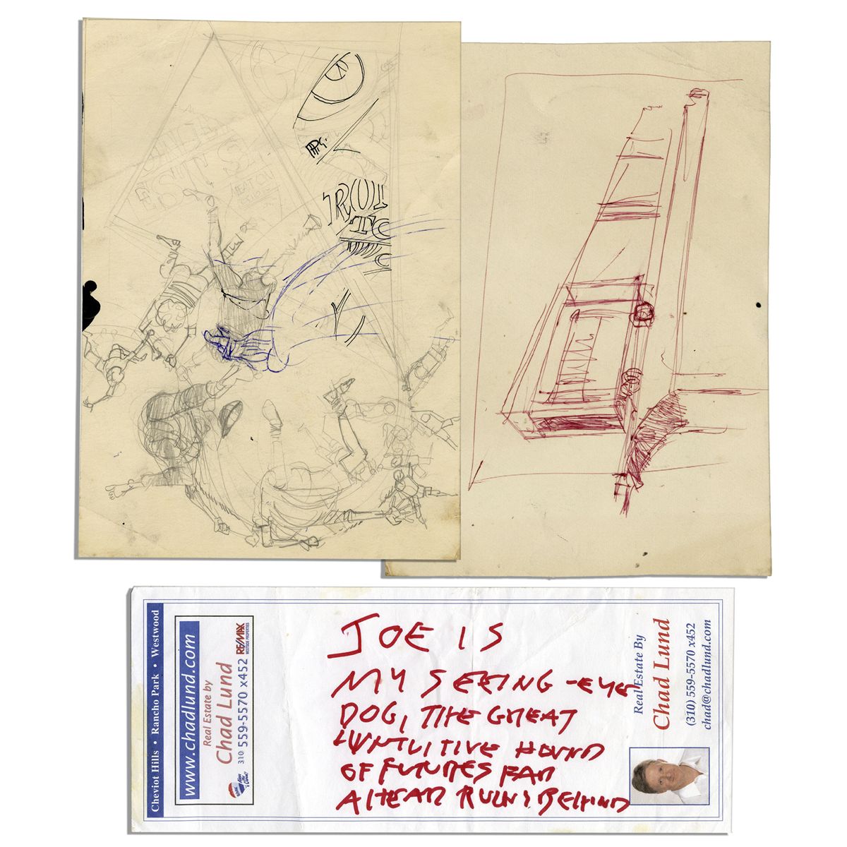 Preliminary cover art by Joseph Mugnaini for Ray Bradbury's ''Halloween Tree''. Pencil and ink drawing on paper features a chain of figures holding hands in mid-air, similar to the cover art for the 1974 Bantam edition of ''Halloween Tree''. On verso is a sketch of Mugnaini's bridge from his well-known painting ''Carnival''. Accompanied by a handwritten note by Bradbury that reads in full, ''Joe is my seeing eye dog, the great intuitive hound of futures far ahead ruins behind''. Art measures 5.5'' x 7.5''. Note measures 8.5'' x 3.5''. Near fine overall. With a COA from the Ray Bradbury estate.