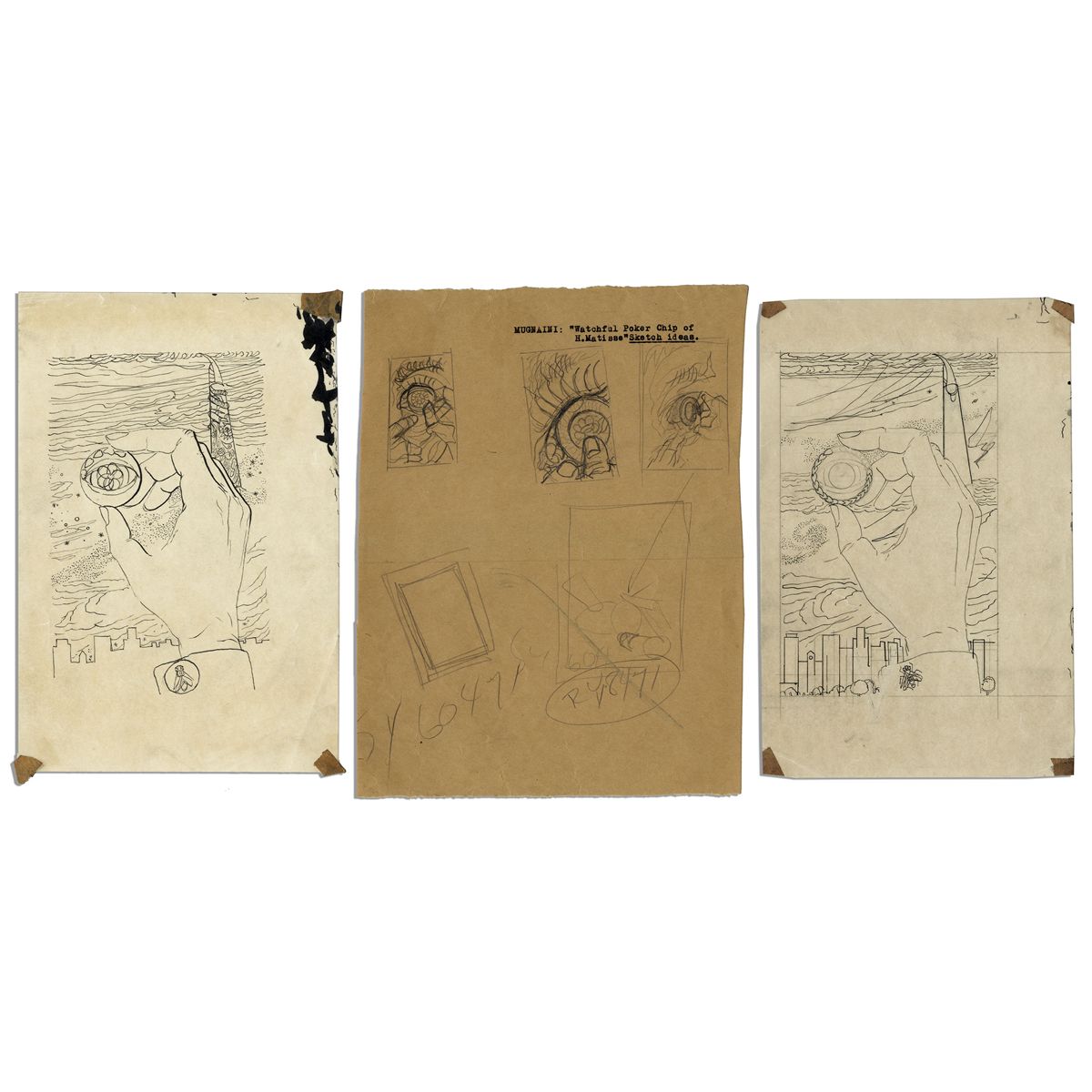 Ray Bradbury personally owned Joseph Mugnaini sketches for his story ''The Watchful Poker Chip of H. Matisse''. Lot of three sketches feature a hand holding the poker chip monocle that is central to the story. One page contains smaller-scale rough sketches of ideas for the art. Sheets measure 7'' x 9.5'' and 6'' x 8''. Near fine. With a COA from the Ray Bradbury estate.
