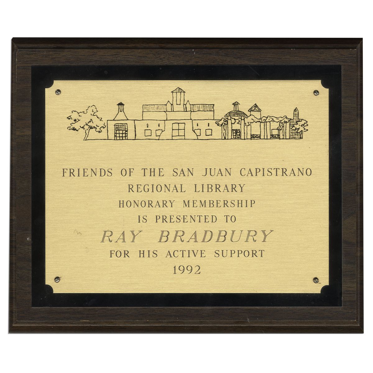 Plaque awarded to Ray Bradbury as an honorary member of the San Juan Capistrano Library, ''...For His Active Support...'' in 1992. Bradbury frequently mentioned in interviews the huge impact that libraries had upon him as a child, and was an avid contributor to them as an adult. Plaque features a sketch of the library. Measures 10'' x 8''. Minor wear to edges of wood, else near fine. With a COA fom the Ray Bradbury estate.