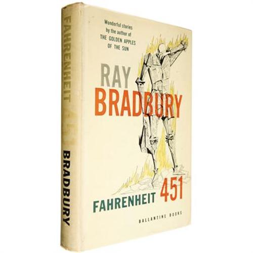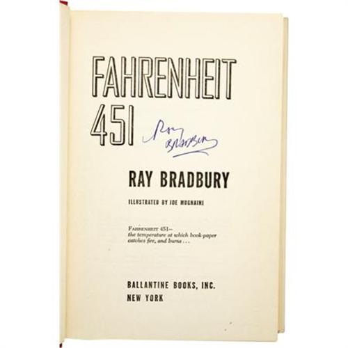 <B>Ray Bradbury: Signed First Edition of <I>Fahrenheit 451</B></I></B></I> (New York: Ballantine Books, 1953), first edition, 199 pages, red cloth with yellow lettering on spine and front board, 8vo (5.5" x 8"), dust jacket. Dust jacket and illustrations by Joe Mugnaini. Includes the stories "The Playground" and "And the Rock Cried Out". Signed "<I>Ray Bradbury</B></I>" on the title page. The book is in very good condition with minor edge wear present. The sunned dust jacket is also very good, with minimal edge wear and one small tear at the front spine fold. A great example of Bradbury's famous novel, signed by the author himself.<BR><BR><b>Shipping:</b> Books & Catalogs (<a target="_blank" href="http://www.heritageauctions.com/common/shipping.php">view shipping information</a>)