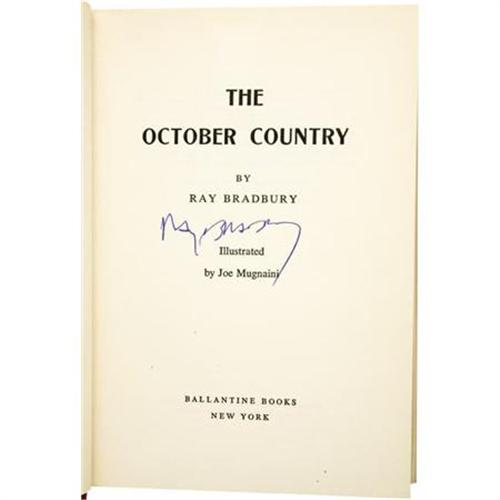 <B>Ray Bradbury: Signed First Edition of <I>The October Country</B></I></B></I> (New York: Ballantine, 1955), first edition, first state ("BB" monogram on spine of book is upside down), 306 pages, red cloth with black lettering on spine, 8vo (5.5" x 8"), dust jacket. Illustrated by Joe Mugnaini. Signed "<I>Ray Bradbury</B></I>" on the title page. For this wonderful collection of macabre and fantastic tales, Bradbury selected and rewrote fourteen stories from his previous Arkham House collection, <I>Dark Carnival</B></I> and added five stories never before published in book form. Some of Bradbury's most famous tales come from this collection, including "The Lake", "The Wind", and "The Small Assassin". At the time this book was published, Bradbury's fan base had grown significantly from the time <I>Dark Carnival</B></I> was published (not to mention it was long out of print), so this book was for most Bradbury fans the introduction to his darker side. Interestingly, Bradbury dedicated this book "For who else but August Derleth", co-founder of Arkham House and publisher of <I>Dark Carnival.</B></I> The copy presented here is about fine, with minor edge and corner wear in a very good dust jacket with sunning to the spine, minor chipping to the spine ends, and lightly rubbed panels. A great collection of Bradbury's more macabre fiction, signed by the author himself.<BR><BR><b>Shipping:</b> Books & Catalogs (<a target="_blank" href="http://www.heritageauctions.com/common/shipping.php">view shipping information</a>)