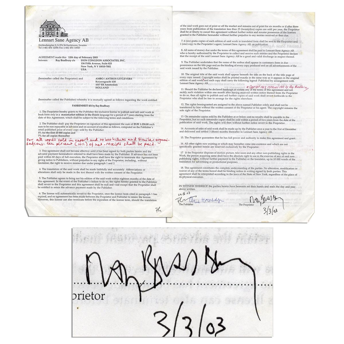 Ray Bradbury ''Fahrenheit 451'' contract signed. Dated 12 February 2003, typed document handles publication matters in Holland for Bradbury's acclaimed dystopian novel. Two-page document on Lennart Sane Agency letterhead is an agreement between Bradbury and Ambro/Anthos Uitgevers of Amsterdam, providing for the publishing house to issue a Dutch language edition of ''Fahrenheit 451'' and sell it for a 7-year term. Signed ''Ray Bradbury'' in black ink on verso and countersigned by a representative for the publisher. Additional handwritten notes by an unknown hand appear in red ink on both sides. Single sheet, front and verso measures 8.25'' x 11.5''. Creasing and a few small stains to first page, else near fine. With a COA from the Ray Bradbury estate. Very rare.