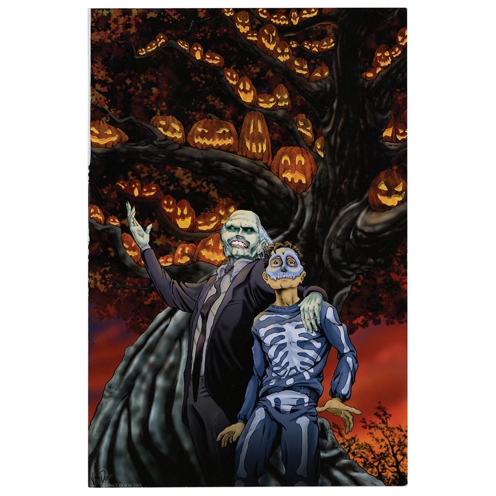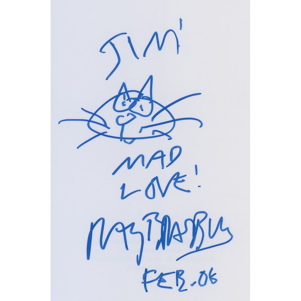 Original felt tip sketch of a cat accomplished by Bradbury inside of a greeting card featuring artwork inspired by Bradbury's 1972 novel The Halloween Tree, 5.5 x 8.25, signed and inscribed in blue felt tip, "Jim! Mad Love! Ray Bradbury, Feb. 06." In fine condition.