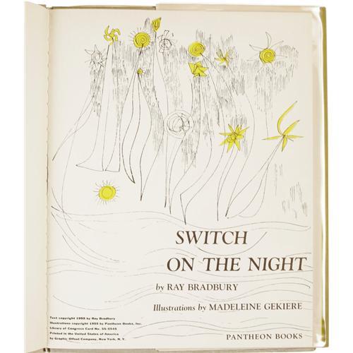 <B>Ray Bradbury:<I> Switch on the Night.</B></I></B></I> (New York: Pantheon Books, 1955), first edition with earliest printing statement on the title page, unpaginated, illustrations by Madeleine Gekiere, gray paper covered boards with yellow and white titles, 8vo (7" x 8.75"), former owner has written "<I>read January 1977</B></I>" in ink on the top corner of the ffep, else fine in a fine unclipped jacket. A beautiful copy of Bradbury's elusive children's book. <I>From the Ventura Collection.</B></I><BR><BR><b>Shipping:</b> Books & Catalogs (<a target="_blank" href="http://www.heritageauctions.com/common/shipping.php">view shipping information</a>)