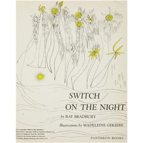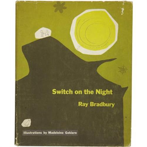 <B>Ray Bradbury. </B></I><B><I>Switch on the Night</B></I></B></I><B>.</B></I> New York: Pantheon Books, Inc., 1955.<BR><BR>First edition, meeting all points as listed in Currey. Octavo. Unpaginated. Illustrations by Madeleine Gekiere.<BR><BR>Grey pictorial boards with titles in white on the spine and yellow on the front board. Light wavy stain at the base of the front board. Shelf wear to the edges of the boards and at the head and foot of spine. Internal contents sound. Dust jacket with general shelf wear, including rubbing at the edges, a few small scuffs, and a few small closed tears. Overall in very good condition.<BR><BR>The first of Bradbury's published children's books. <I>From the Robert and Diane Yaspan Collection.</B></I><BR><BR><b>Shipping:</b> Books & Catalogs (<a target="_blank" href="http://www.heritageauctions.com/common/shipping.php">view shipping information</a>)