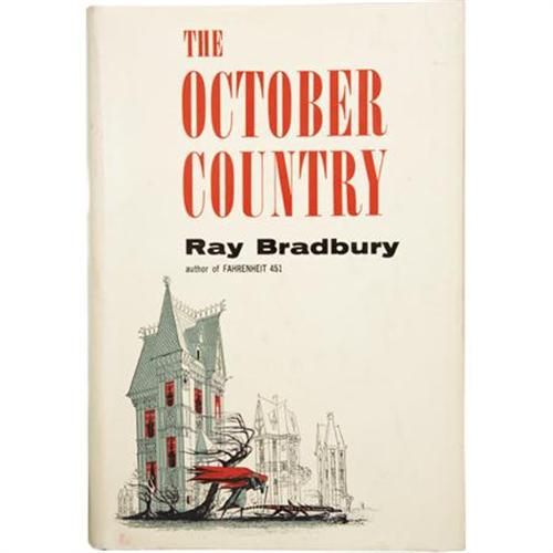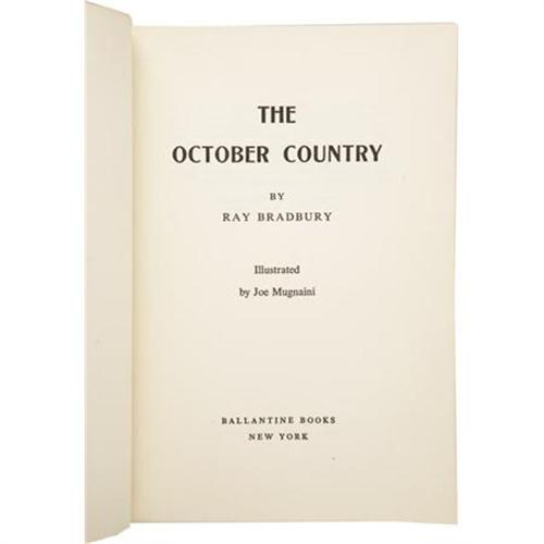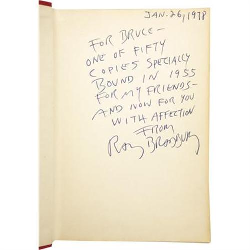<B>Ray Bradbury. </B></I><B><I>The October Country</B></I></B></I>. New York: Ballantine Books, [1955]. <BR>First edition (Currey binding A). One of fifty first edition copies Bradbury had specially bound as gifts for his friends. Inscribed by the author "Jan. 26 1978 For Bruce - One of fifty copies specially bound in 1955 for my friends - and now for you with affection from Ray Bradbury" on the front free endpaper. Octavo. 306 pages. Illustrated by Joe Mugnaini.<BR><BR>Publisher's red cloth with gilt spine titles. In original pictorial dust jacket. Housed in a custom red cloth solander box with a black leather title plate affixed to the spine and lettered in gilt. Minimal soiling to the bottom edge of the boards. Textblock edge toned slightly. Dust jacket spine lightly sunned, with minor rubbing to the boards and wear to the corners, including a .75 inch tear at the front flap fold. A tiny .25 inch portion lost at the top edge of the rear panel of the dust jacket. Overall, a very good copy of one of Bradbury's great works.<BR><BR>"Four stories appear for the first time in book form, 'The Dwarf,' 'The Watchful Poker Chip of H. Matisse,' 'Touched with Fire,' and 'The Wonderful Death of Dudley Stone.' Remainder are reprinted, most with revisions from <I>Dark Carnival</B></I>." (Currey 46) <I>From the Robert and Diane Yaspan Collection.</B></I><BR><BR><b>Shipping:</b> Books & Catalogs (<a target="_blank" href="http://www.heritageauctions.com/common/shipping.php">view shipping information</a>)